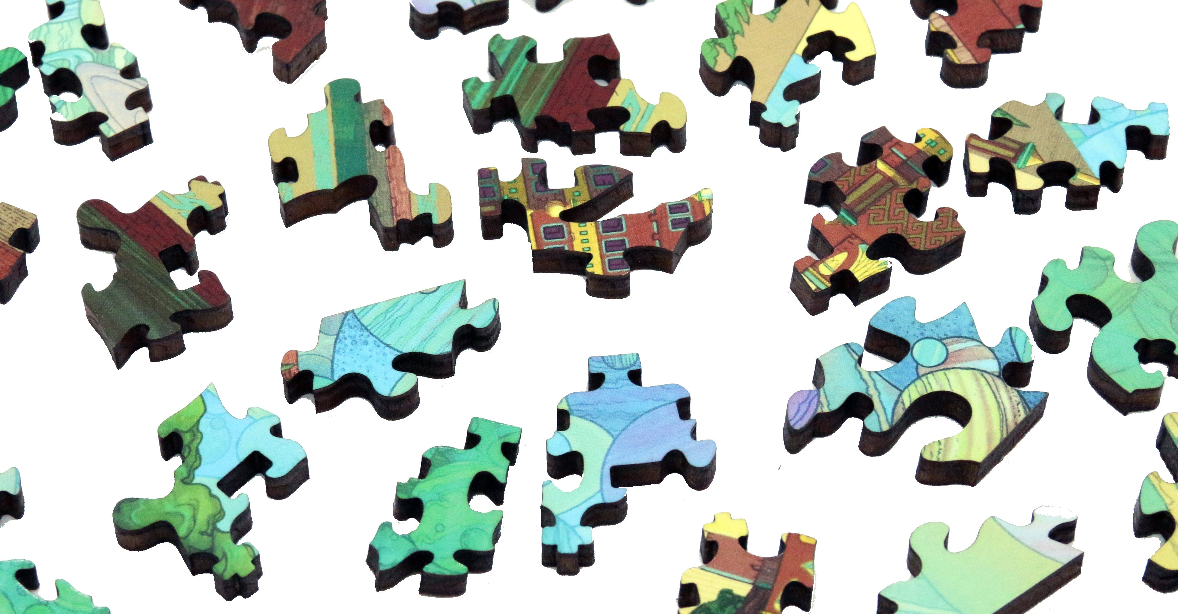 This wooden jigsaw puzzle has 554 pieces with a beautiful cosmic sci-fi  painting by Aaron Wolf.