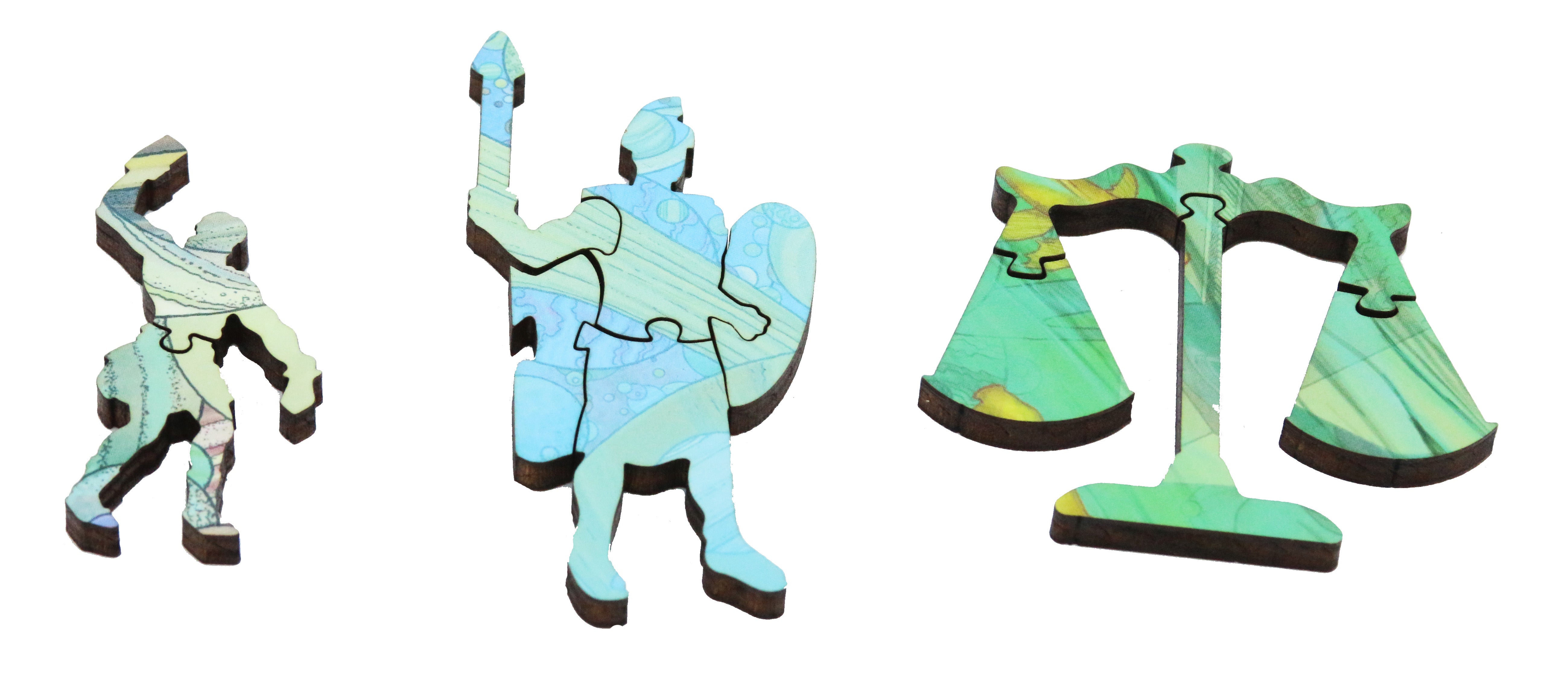 The puzzle difficulty is average, with a straight edge, irregular piece shapes, a mix of knob and other connector shapes, and large multi-piece whimsies evoking Greek mythology, the puzzle was designed by Gema Palacios and David Figueiras.