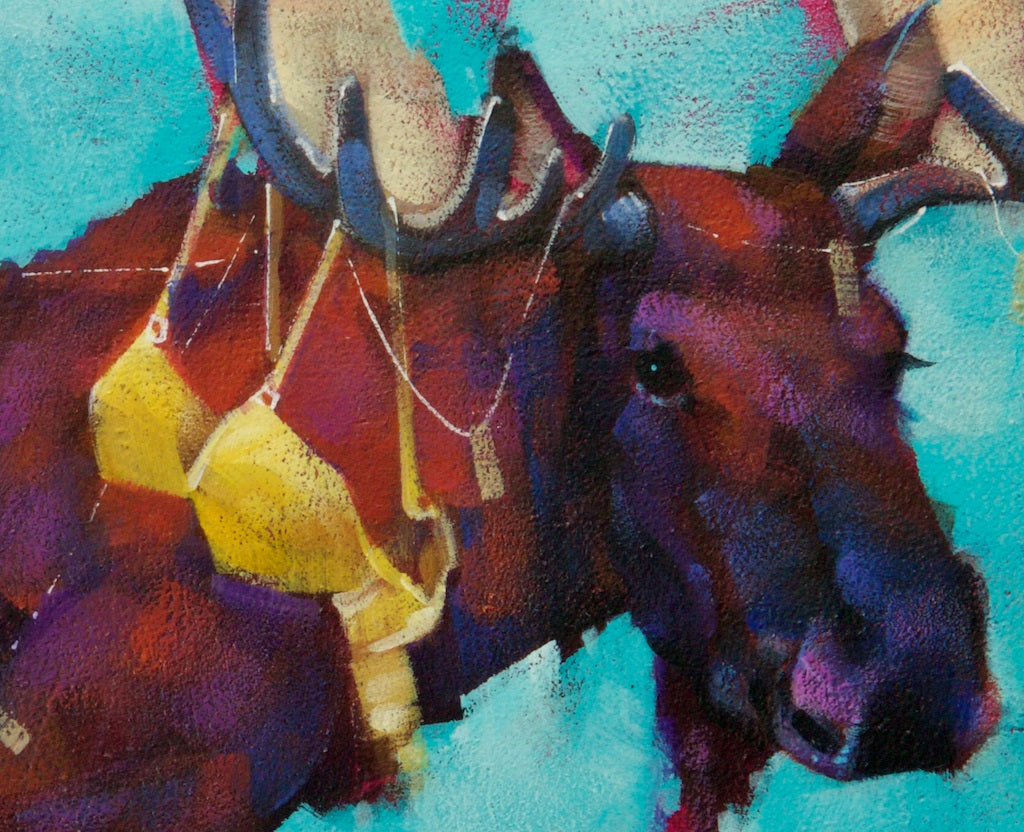 Pun on word taken literally (trapped in 3 bras -one is a whimsy), cute cut-out, wavy edge, lots of whimsies (amongst others two beavers and a squirrel wearing hats), beautiful colors (the moose is a symphony of browns, reds and purples)... what's not to like?!