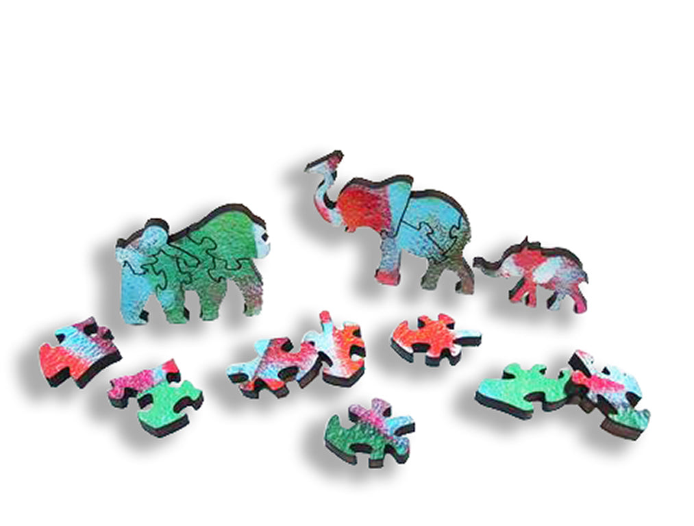 An adorable 399 piece wooden jigsaw puzzle featuring Angie Rees' "Precious Cargo." Designed by Tara Flannery with extra whimsies, this puzzle features a straight edge, giraffe-spot inspired tessellated piece shapes, and herds of baby animal whimsy pieces!