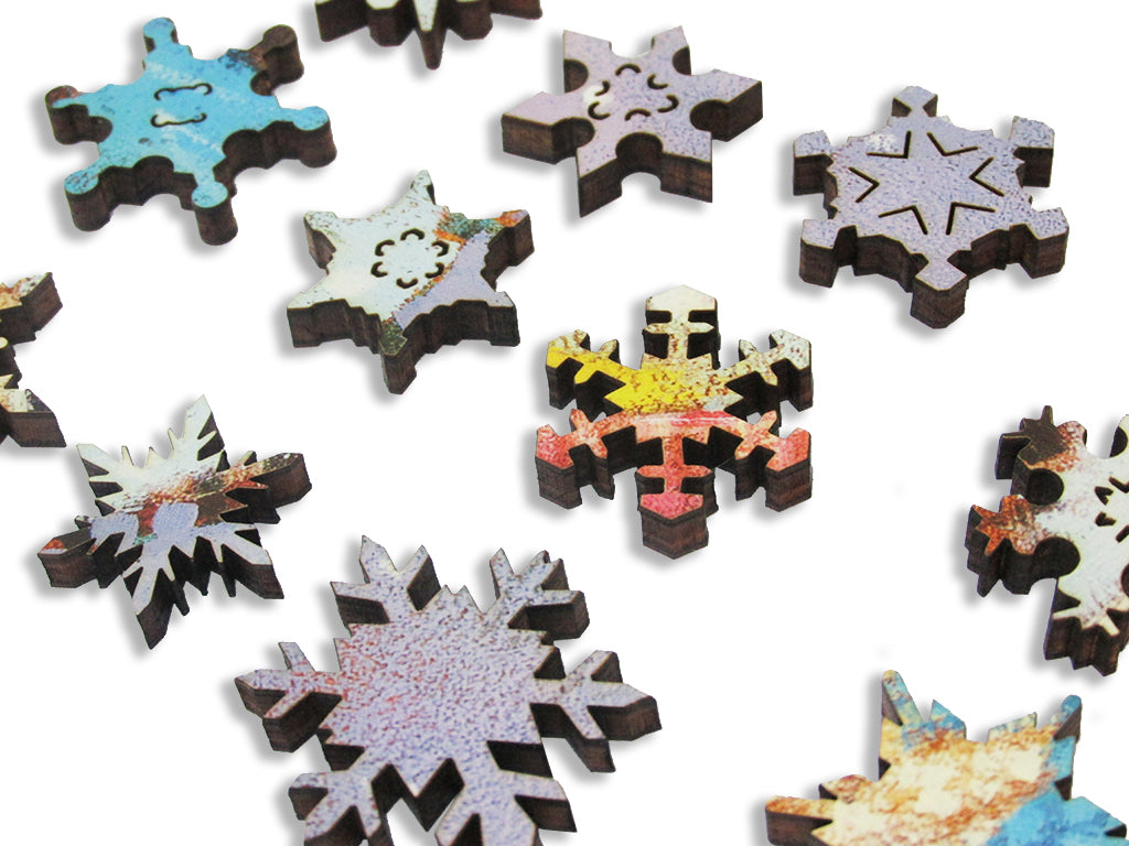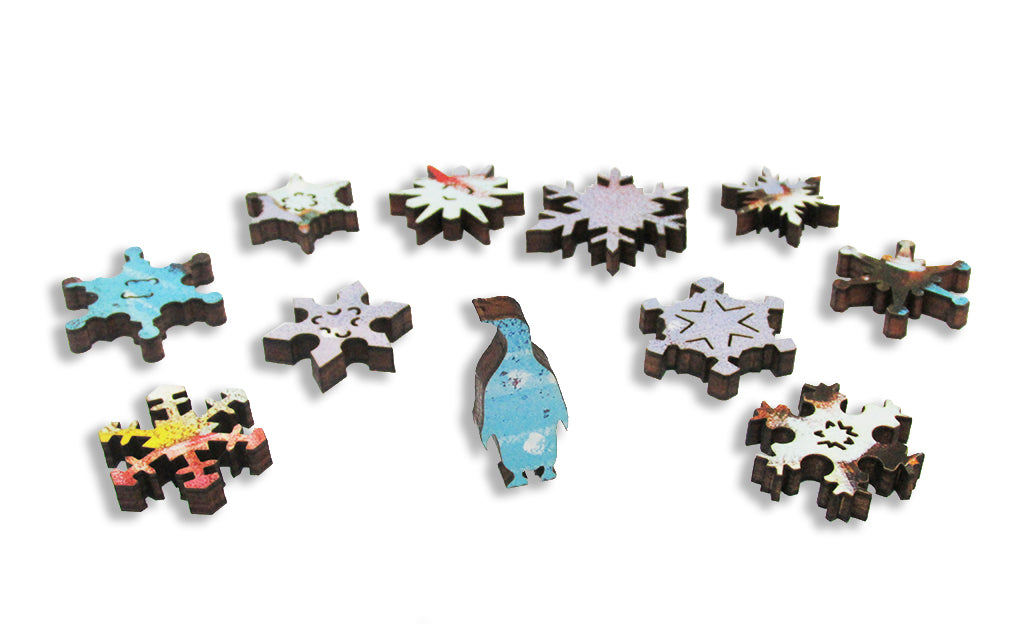 This average-difficulty puzzle contains huge multi-piece whimsies that paints a scenery of their own. The whimsies are winter / penguin themed (and there are no Christmas specific whimsies). Puzzle design by Jef Bambas.