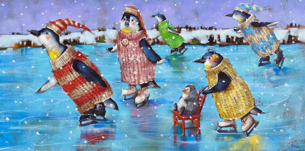 This is a 502 piece wooden jigsaw puzzle featuring Angie Rees' painting "The Skating Party." Lace up your ice skates and get in the winter spirit with these colorfully dressed penguins and beautifully textured landscape.