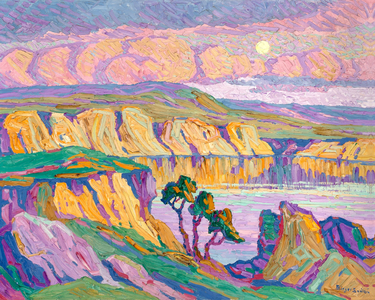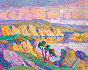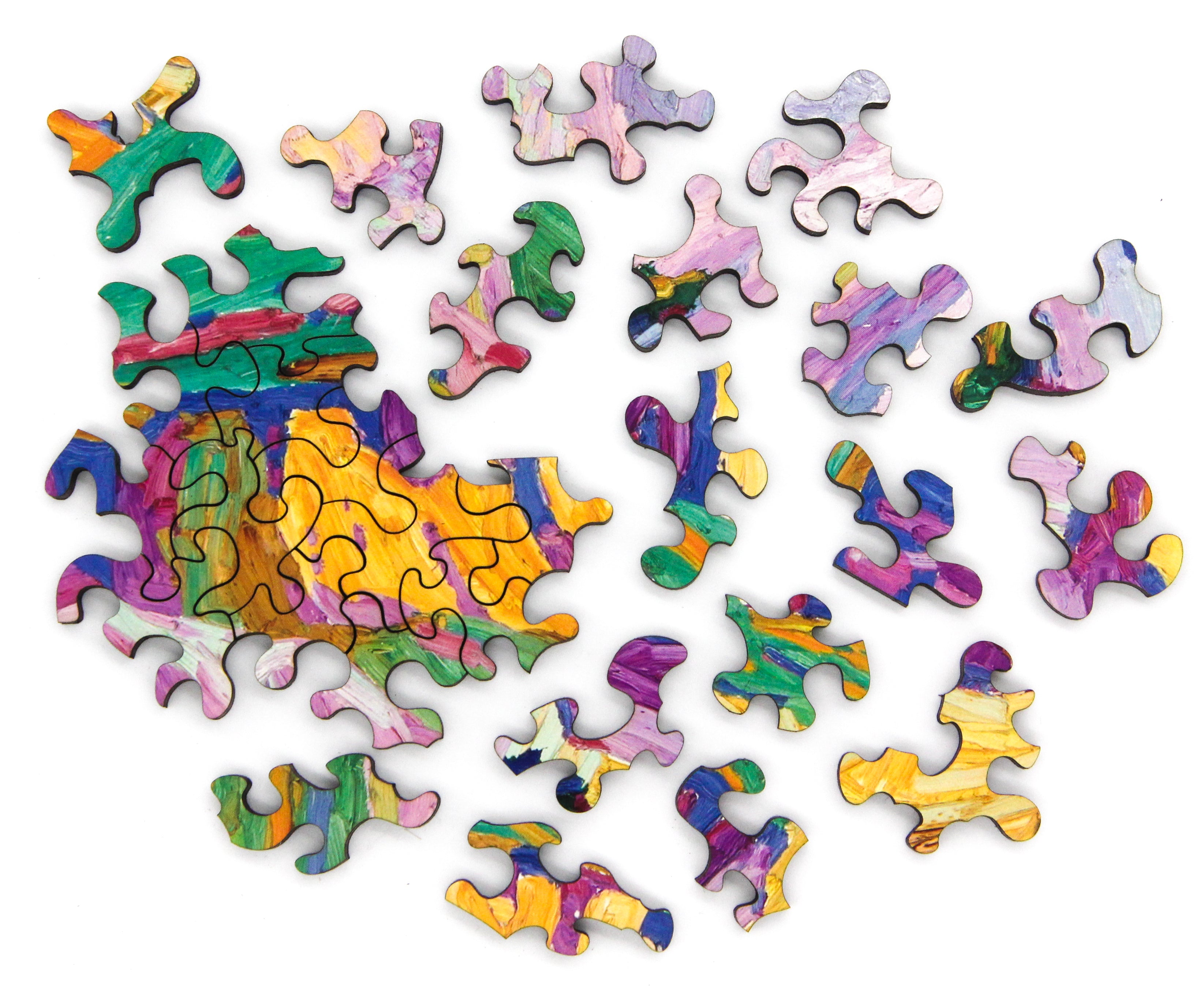 This 325 piece wooden jigsaw puzzle of Kansas Swede painter Birger Sandzen's 1927 painting Creek At Twilight is average difficulty, with whimsy pieces, curvy piece shapes with knob connectors, and a straight edge. Puzzle design by David Figueiras.