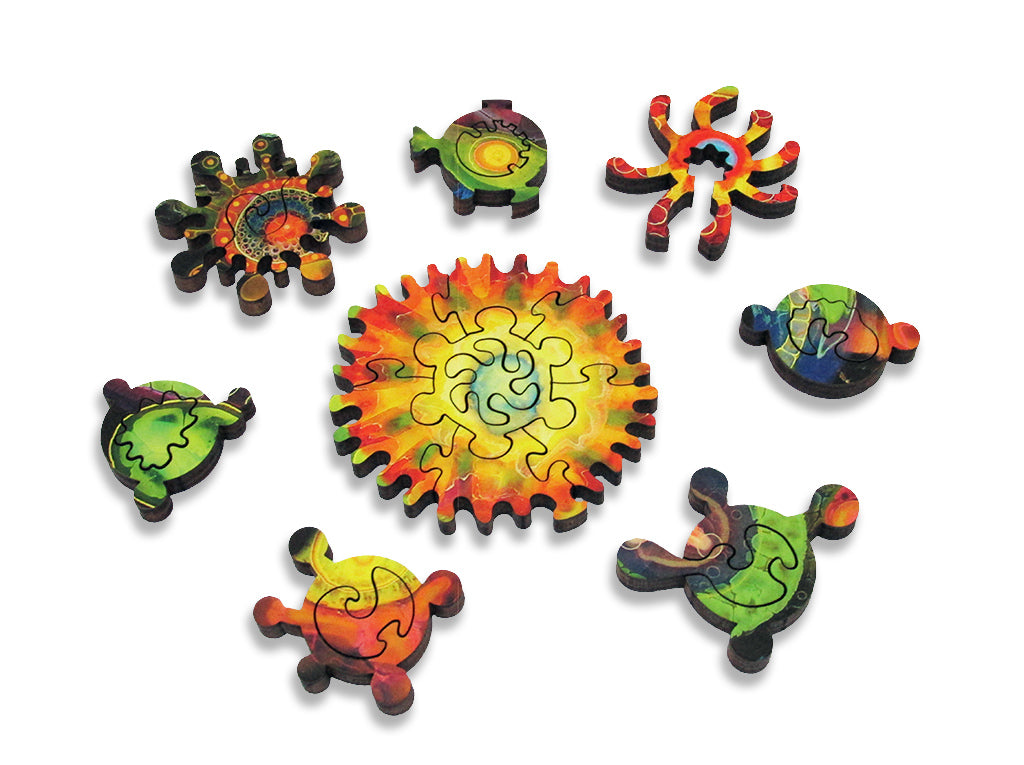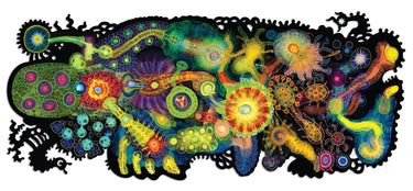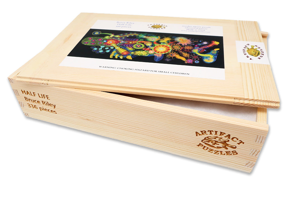 This is a 336 piece wooden jigsaw puzzle featuring Bruce Riley's abstract artwork "Half Life." Puzzle designer Tara Flannery has created a masterful puzzle with its irregular edge, clever themed whimsies, and endless array of different types of connectors. NOTE: The irregular edge is not shown in the image on the box! The puzzle is harder than average.