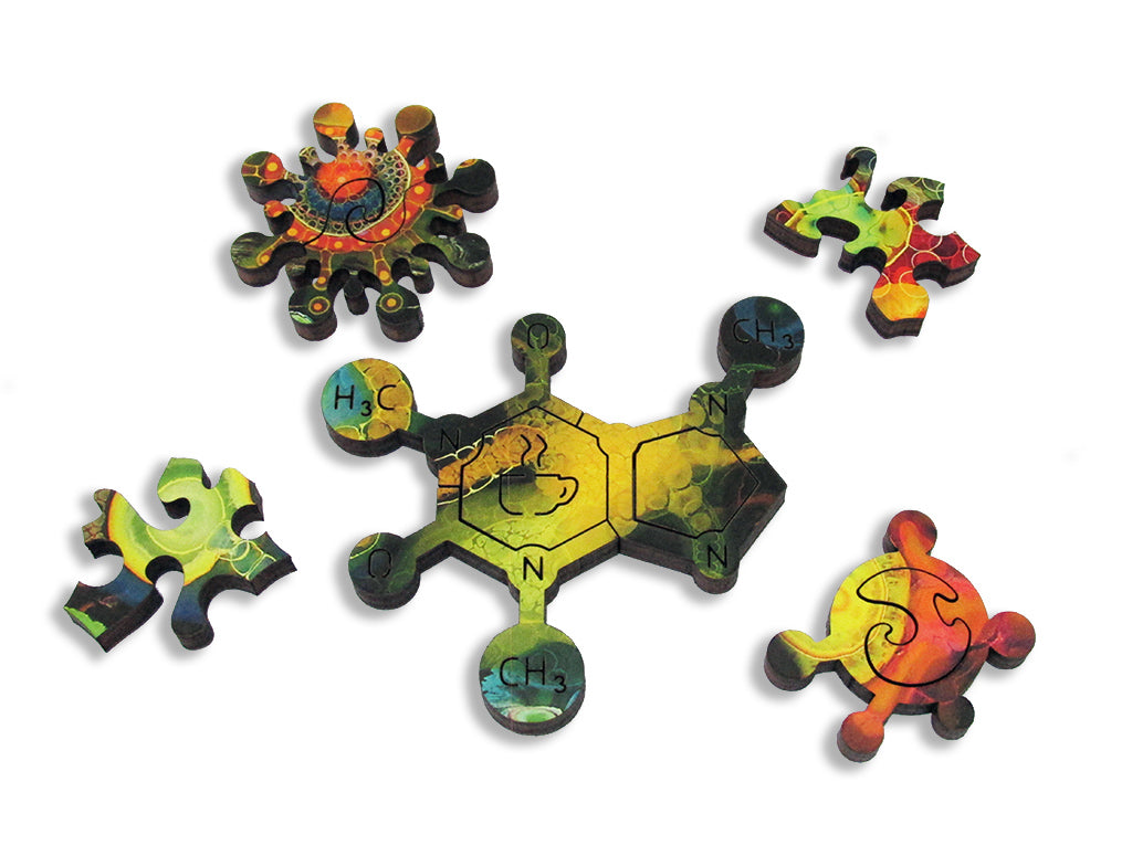 Review: "Half Life" as a standalone puzzle is one of Artifact Puzzles best. Irregular edge, brilliant colors and the organic chemistry themed whimsies will please many life science nerds. The fun lasts longer with "Half LIfe" than with "Stem Cell" because it is a bit bigger and has some areas that need different solving approaches due to shifts in the cut style. This puzzle can combine with "Stem Cell" with some separately purchased connectors. Doing "Stem Cell" plus "Half Life" together is amazing fun, and HIGHLY recommended. See the matching linking review of the "Stem Cell" puzzle.