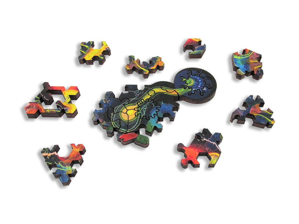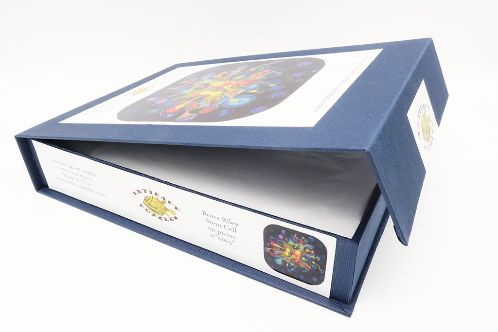 This is a 191 piece wooden jigsaw puzzle of Bruce Riley's painting "Stem Cell". Designed by Tara Flannery, the themed whimsies and miniature hexagonal connectors coupled with psychedelic colors and abstract shapes make for an exciting experience. The puzzle's irregular, microscopic-themed edge adds to the uniqueness and challenge (the difficulty is above average). NOTE: The irregular edge is not shown in the image on the box!