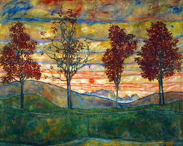 This is a richly-colored 79 piece wooden jigsaw puzzle of the painting Four Trees by artist Egon Schiele.