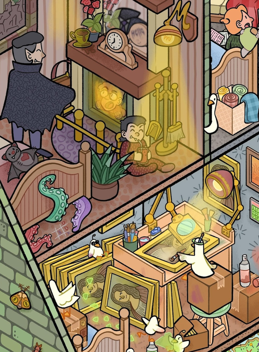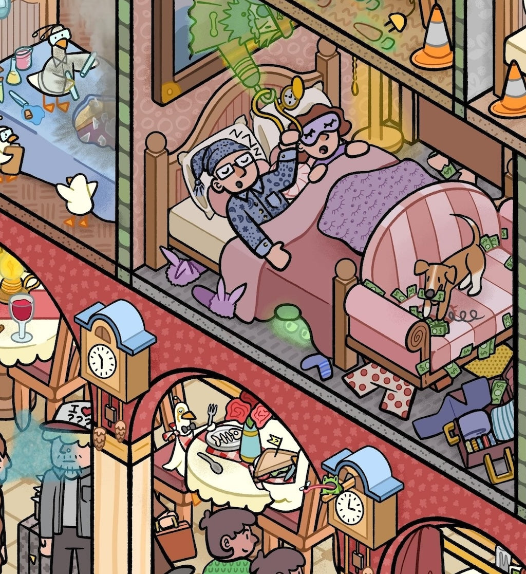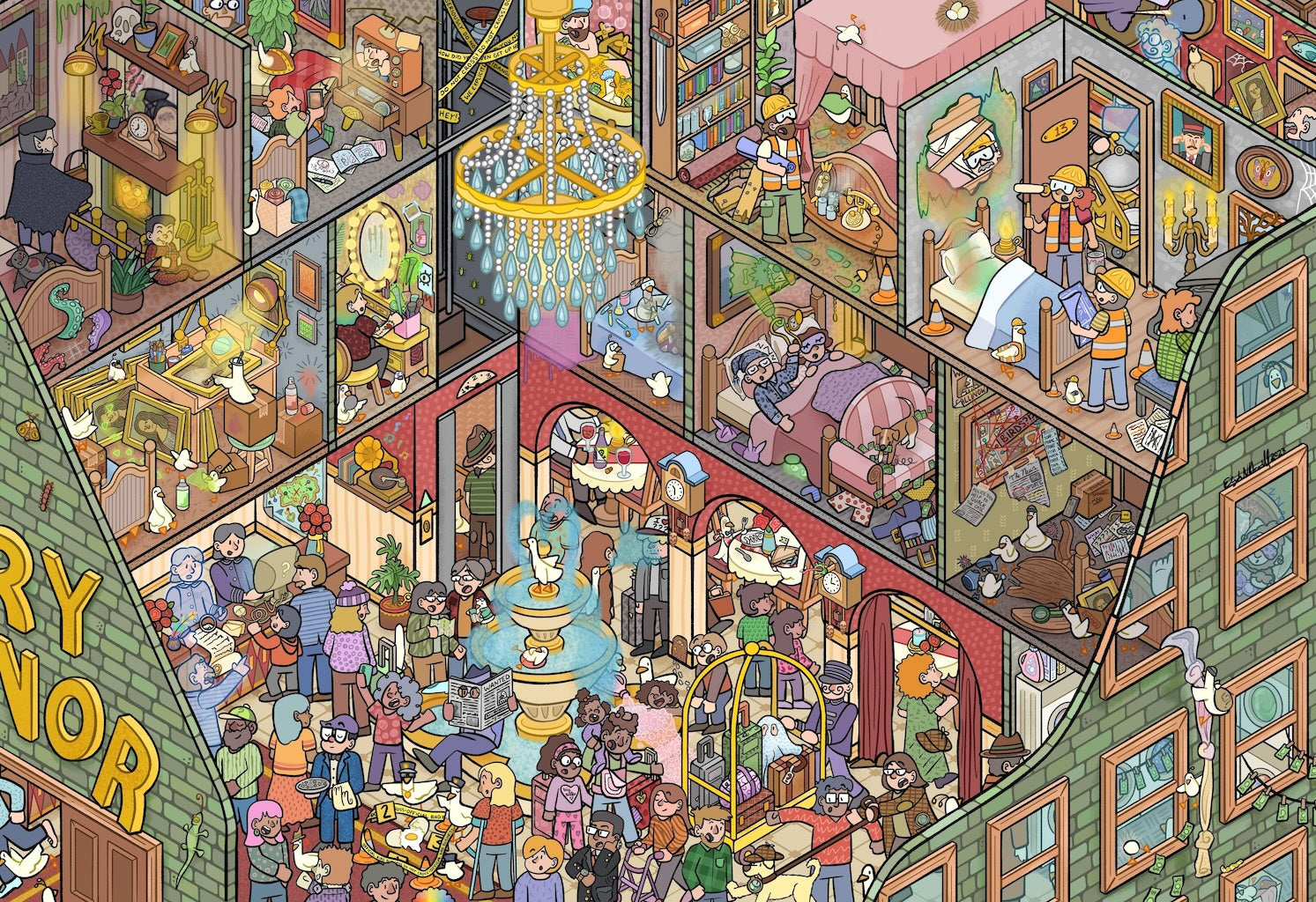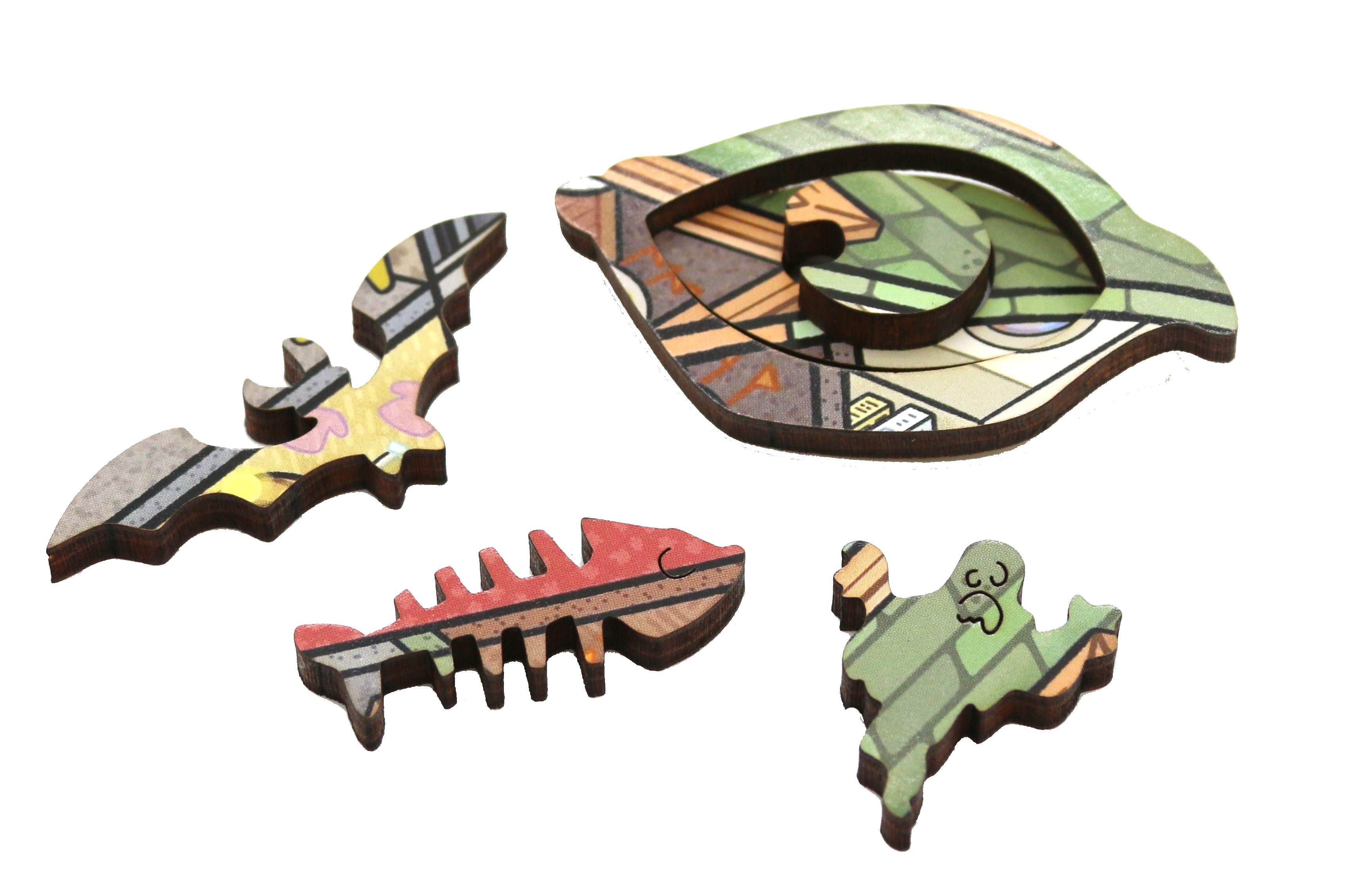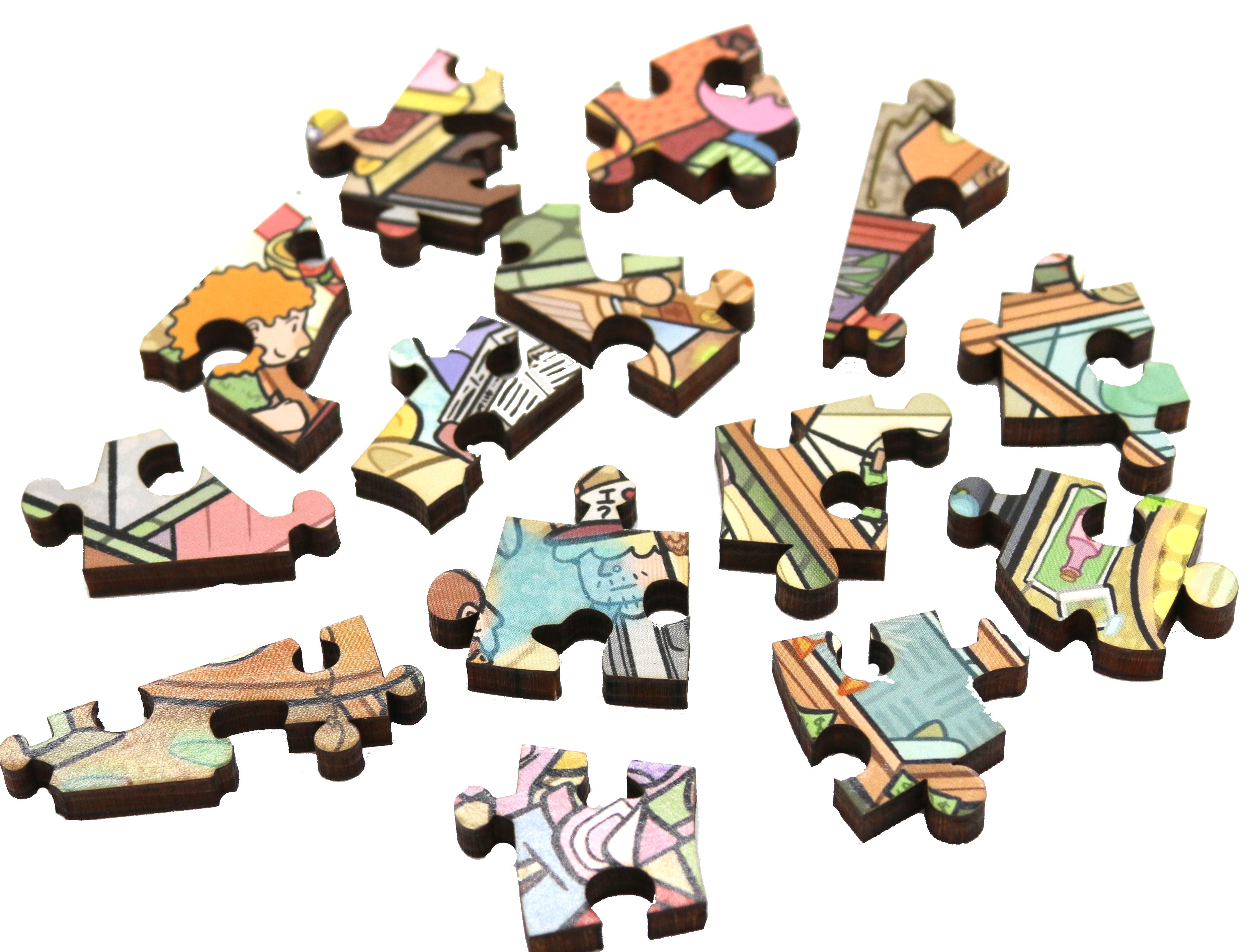 This wooden jigsaw puzzle has 439 pieces and is full of furtive, fun and inexplicable goings-on at the Mystery Manor, from Haswellian ducks forging Mona Lisa paintings to ghosts and vampires.