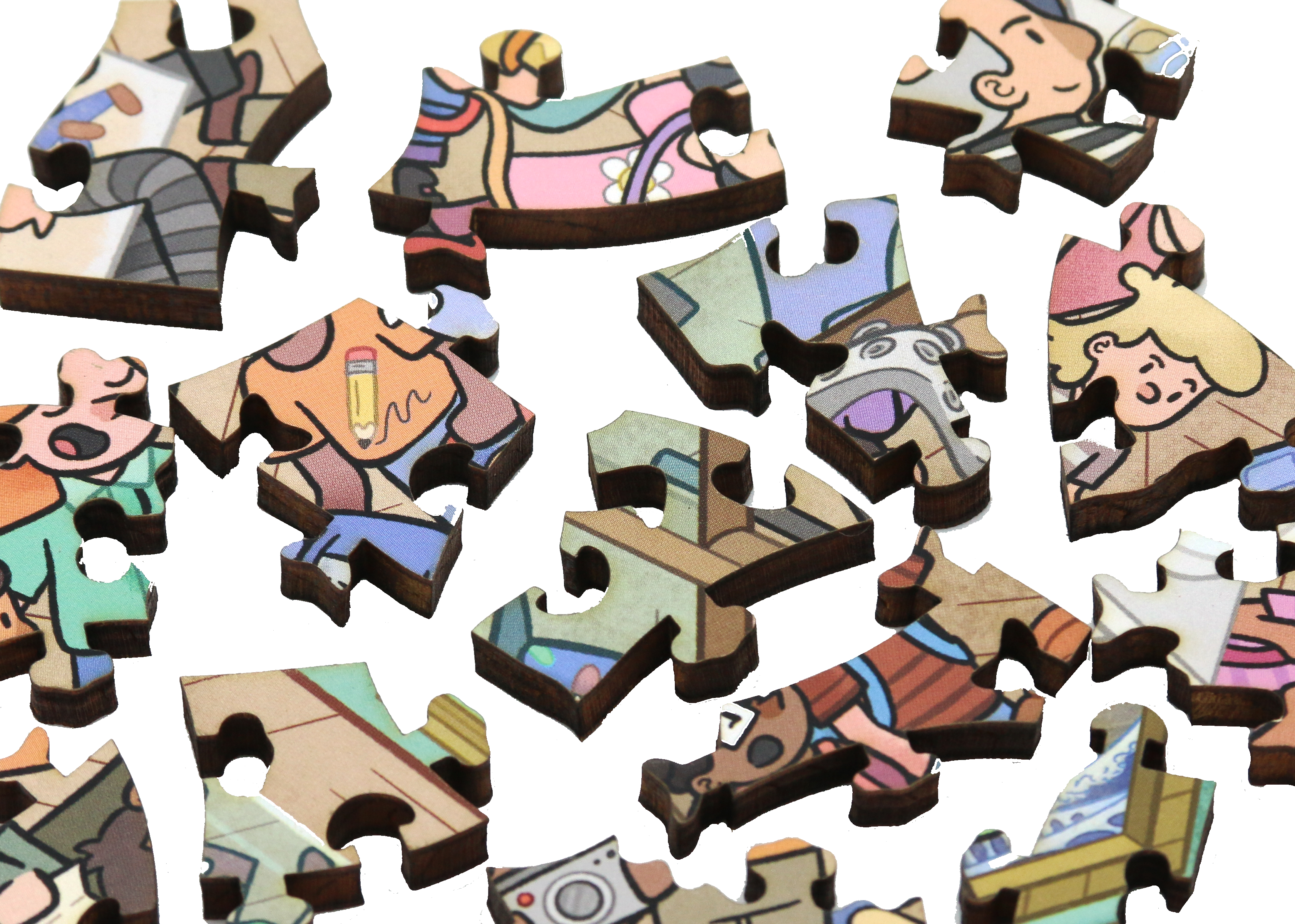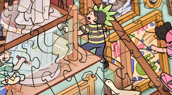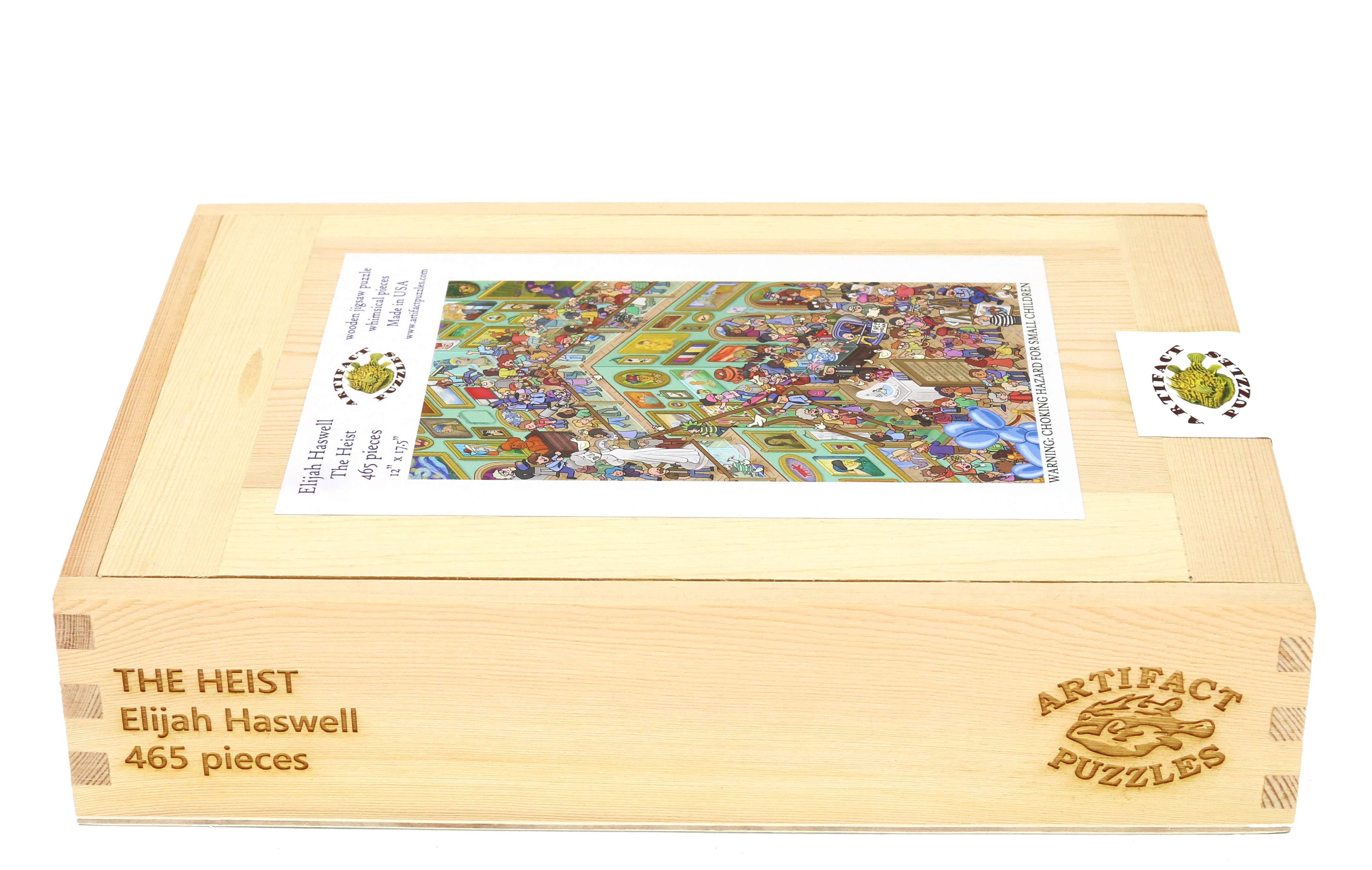 The Heist is a 465 piece wooden jigsaw puzzle and a highly-detailed and comical look at a heist at an art museum by Elijah Haswell.