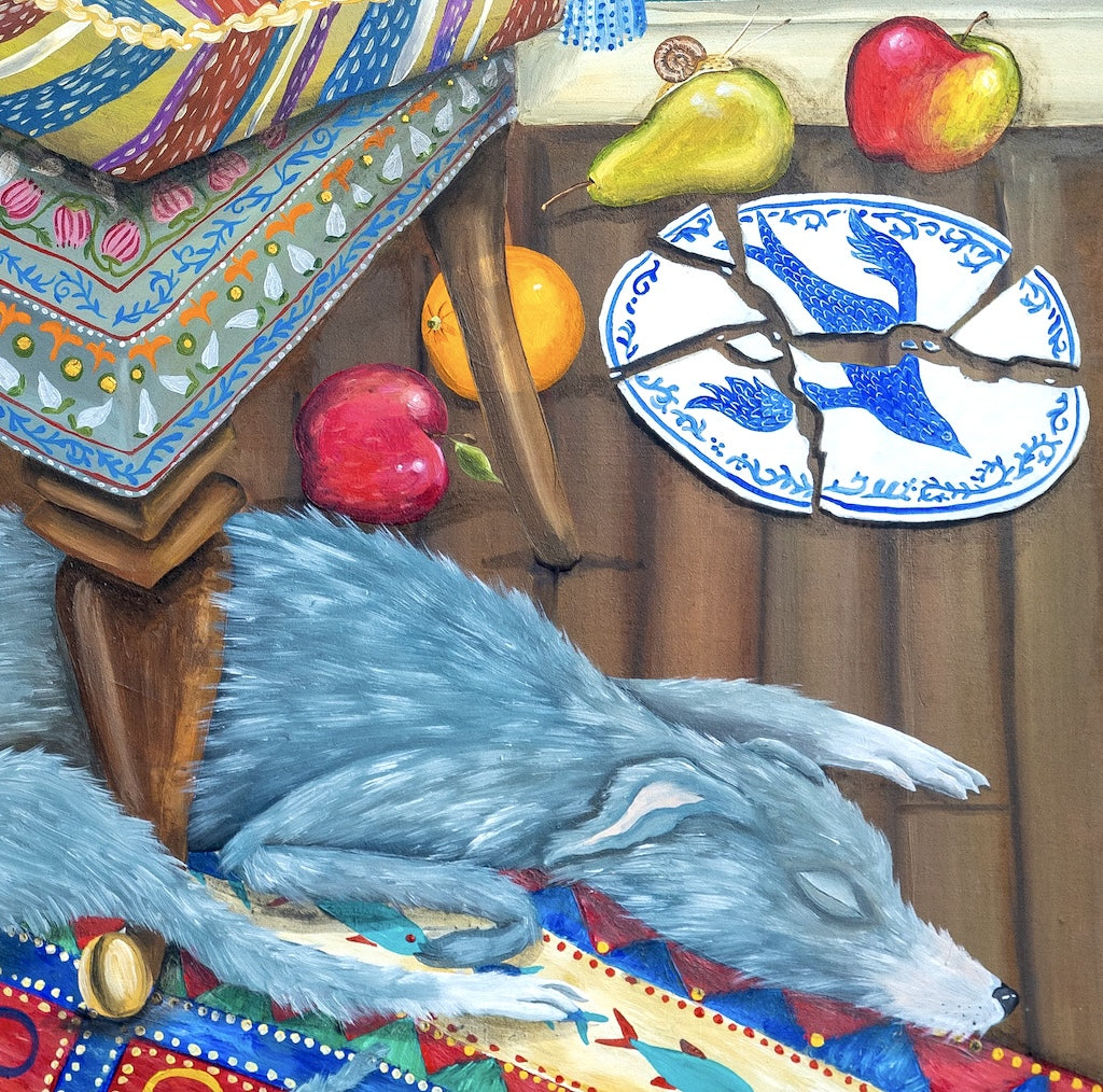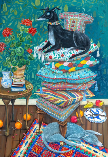 This 474 piece wooden jigsaw puzzle is a painting by Emily Carew Woodard of two naughty dogs resting after some overly exuberant play. The painting is also known as "You Take The Blame."