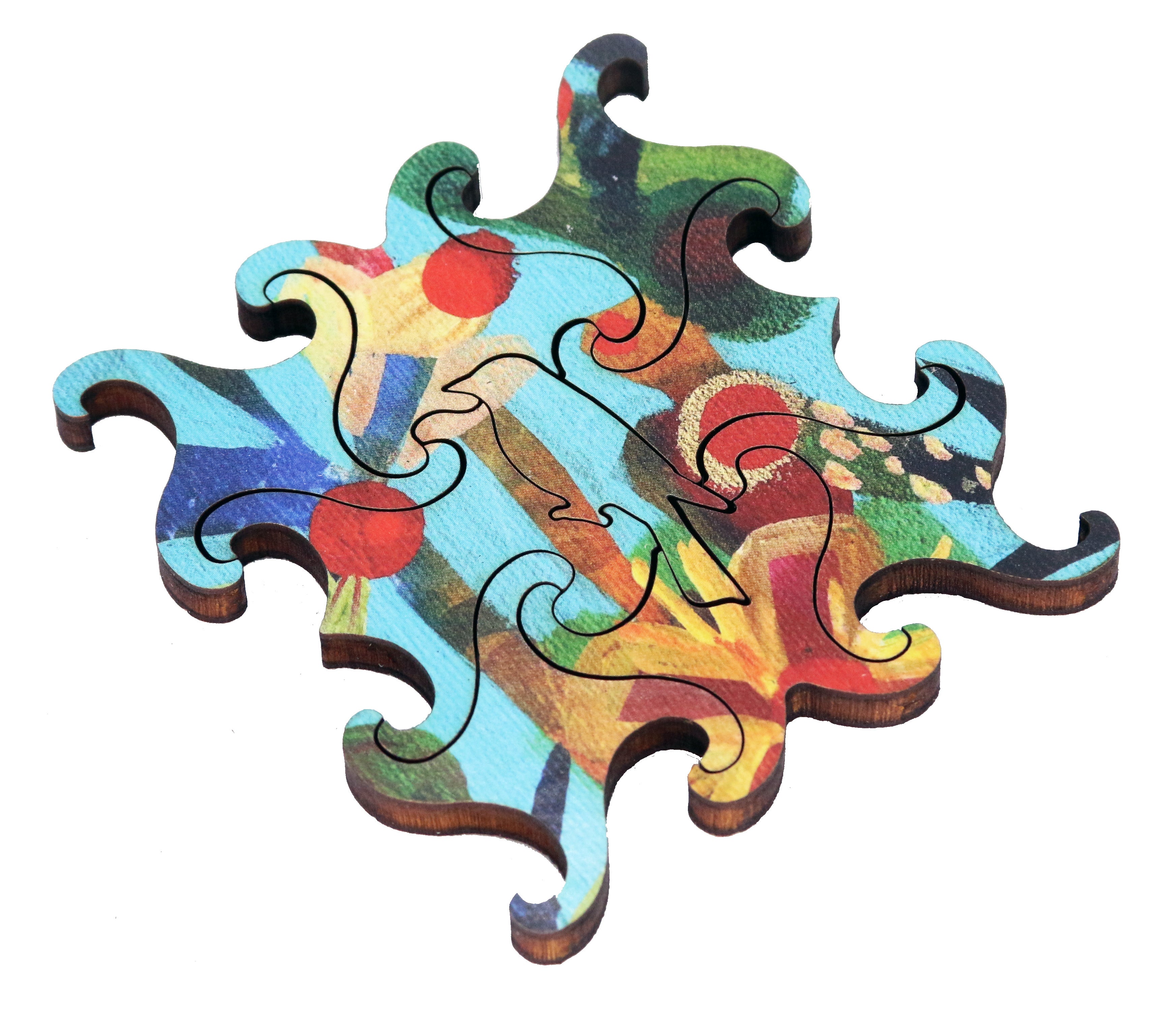 This challenging 225 piece wooden jigsaw puzzle is really hard for its size because it has our unique split tendril connector pieces, just a couple of whimsies, and a decorative edge that arises naturally from the piece shapes so you can't sort out the edge pieces ahead of time. Puzzle design by Tara Flannery.