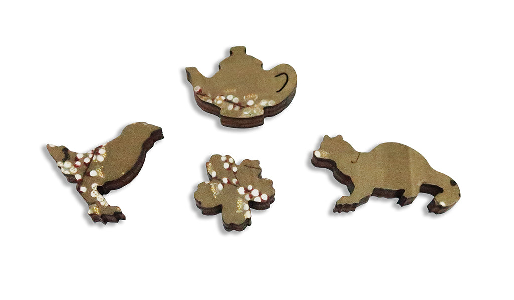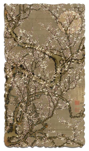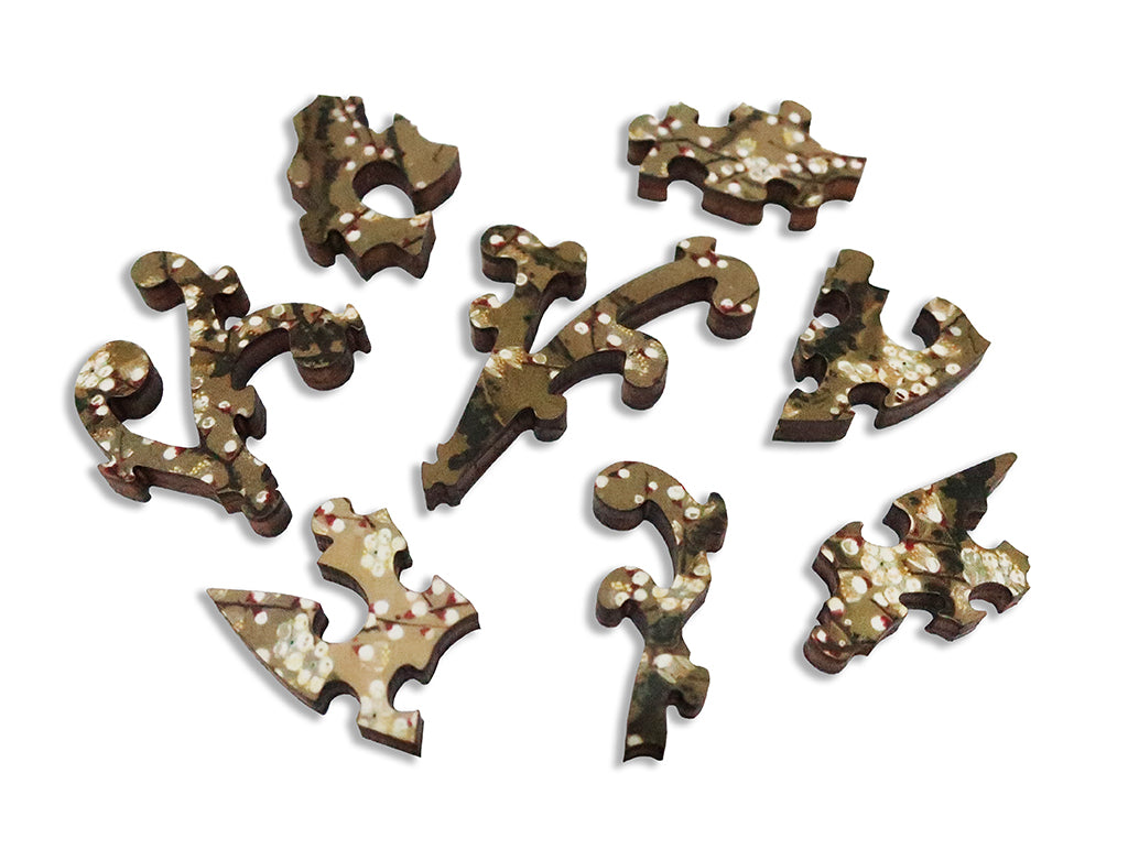 This is a 311 piece very challenging wooden jigsaw puzzle of Ito Jakuchu's ethereal "Plum Blossoms." The art, with its care and subtlety, is given structure through a design by David Figueiras and Ashley Boyd: the puzzle design weaves a maze of budding tree branches and themed whimsies throughout, and has unique piece shapes and a flowing irregular edge.