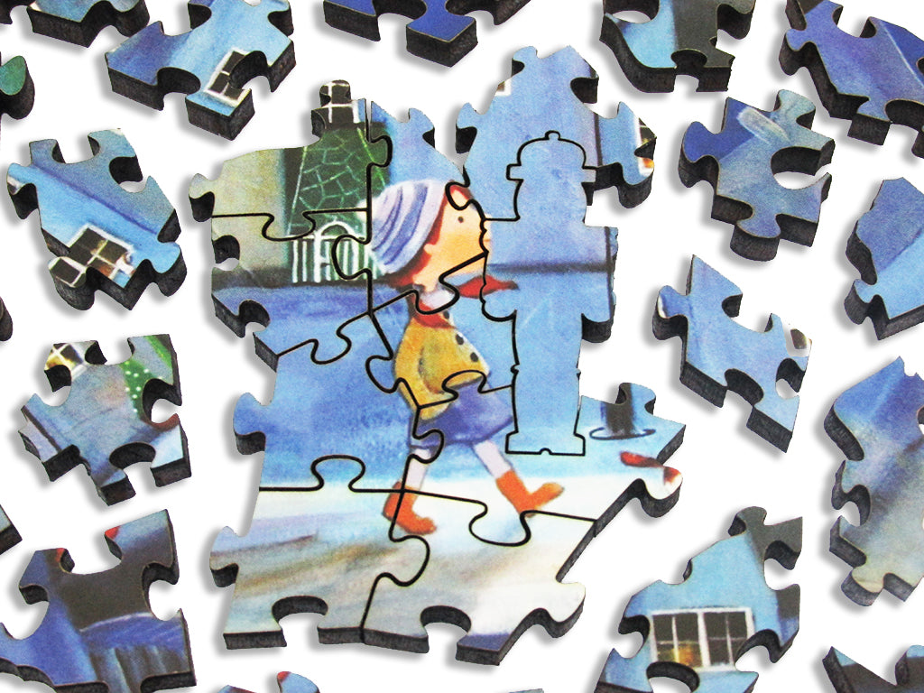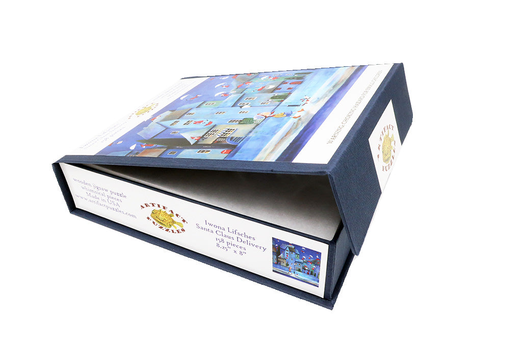This is a 158 piece wooden jigsaw puzzle featuring Iwona lifsches', "Santa Claus Delivery." Designed by Matt Lyon, this puzzle contains many festive whimsies, a straight edge, and a whole lot of holiday spirit. Get cozy next to the fire with your hot chocolate and enjoy this jolly good time of a puzzle. This puzzle has a straight edge.