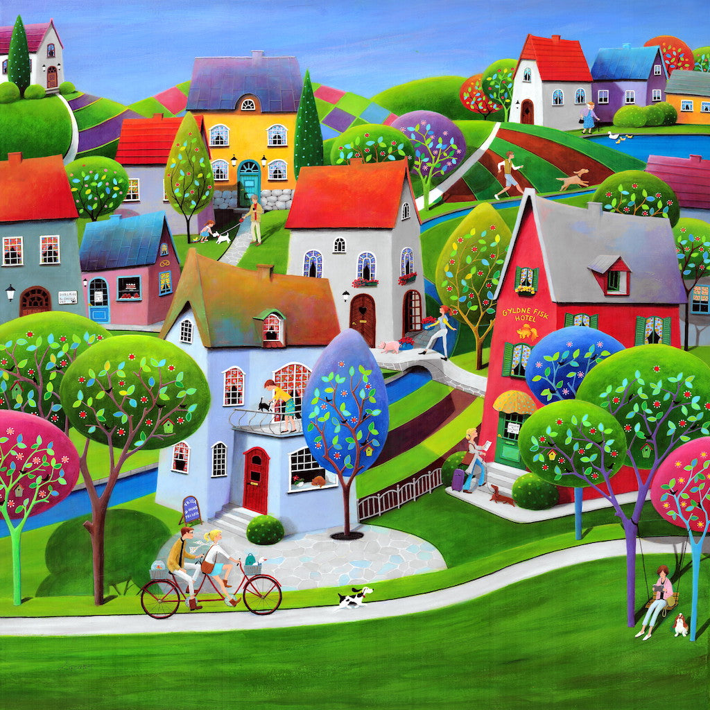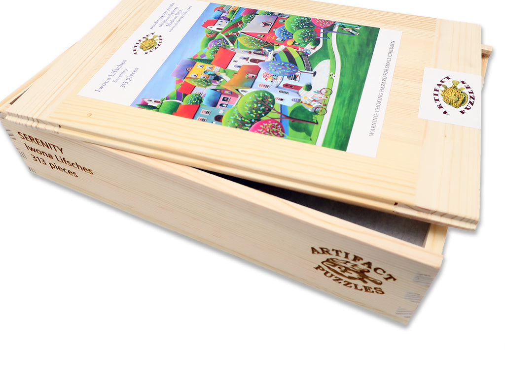 Our 313 piece Serenity wooden jigsaw puzzle features a warm and welcoming town scene by Danish artist Iwona Lifsches.