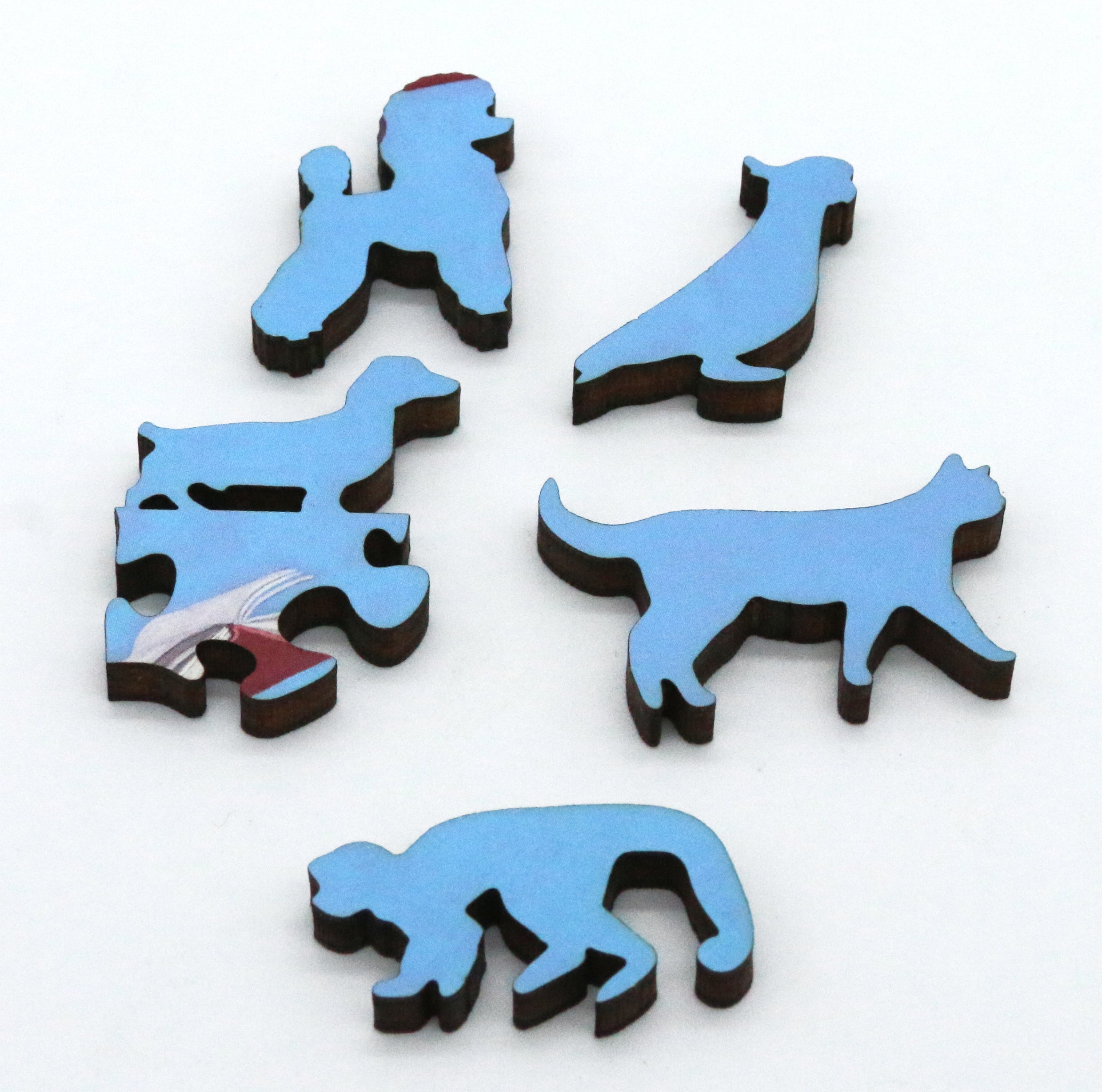 Puzzle design by Matt Lyon has square-ish pieces and a pack of dog and other pet whimsies, and a really fun whimsical edge on top (irregular edge on top edge only), and lots of drop-outs (that is, we leave-out bit of puzzle on purpose to highlight whimsical features).