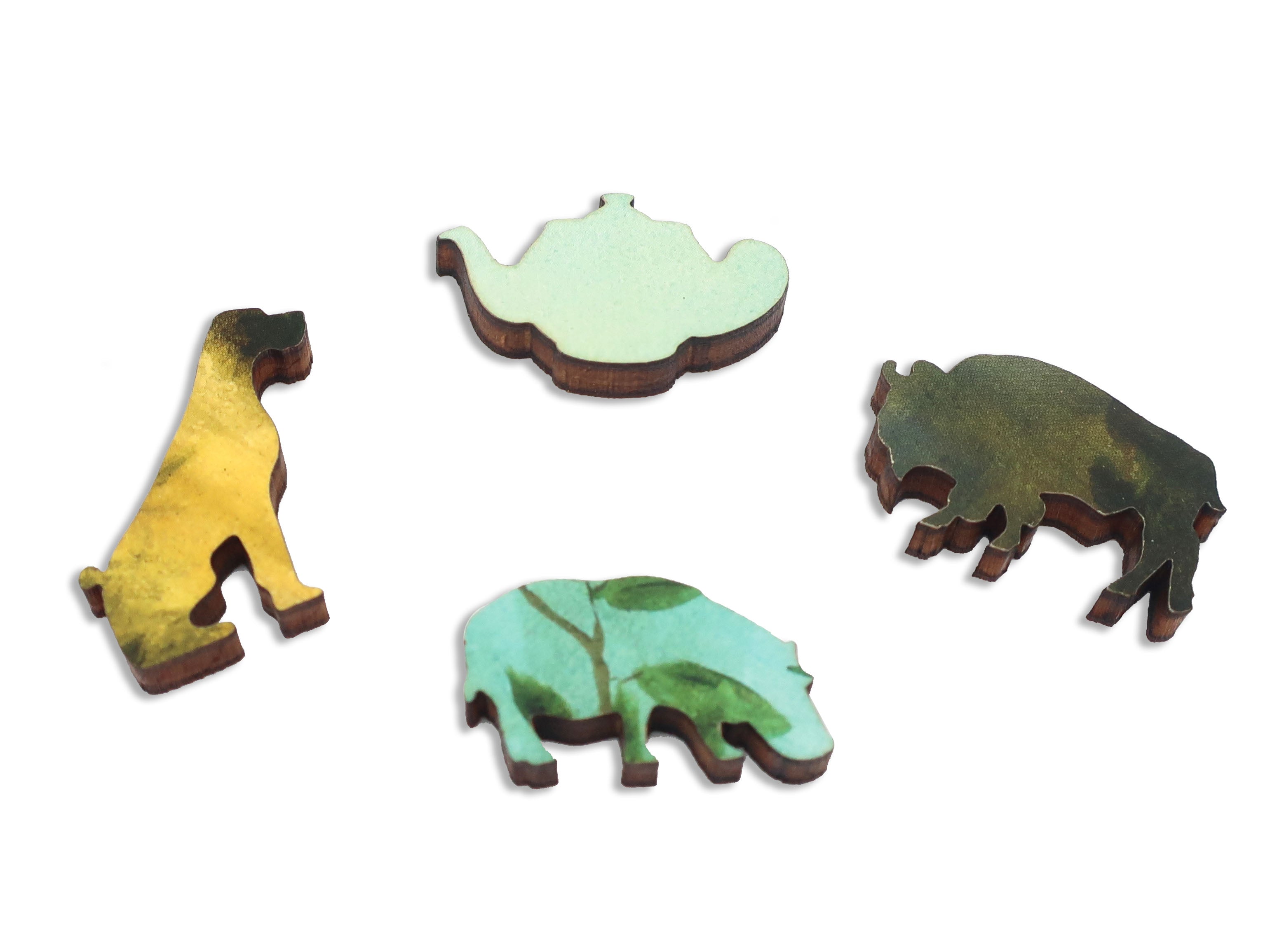 This is a 326 piece wooden jigsaw puzzle of "Our Gentle Giant" by Kevin Sloan. The colorful elephantine art is paired with a semi-chaotic design by Matt Lyon that includes mostly-animal-themed whimsies that are gentle on the eyes, a three-quarters-irregular edge, and a double-digit pachyderm count. The difficulty is harder than average. Not to be confused with Consequences of Hypnosis. NOTE: The irregular edge is not shown in the image on the box! Like all our puzzles, made with 1/4" thick wood and the pieces are laser-cut. Packaged in our standard pine wood box. Made in the USA.