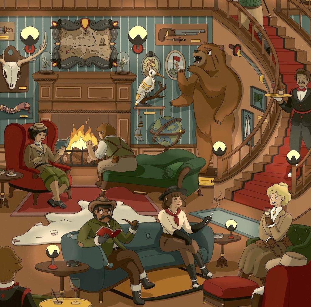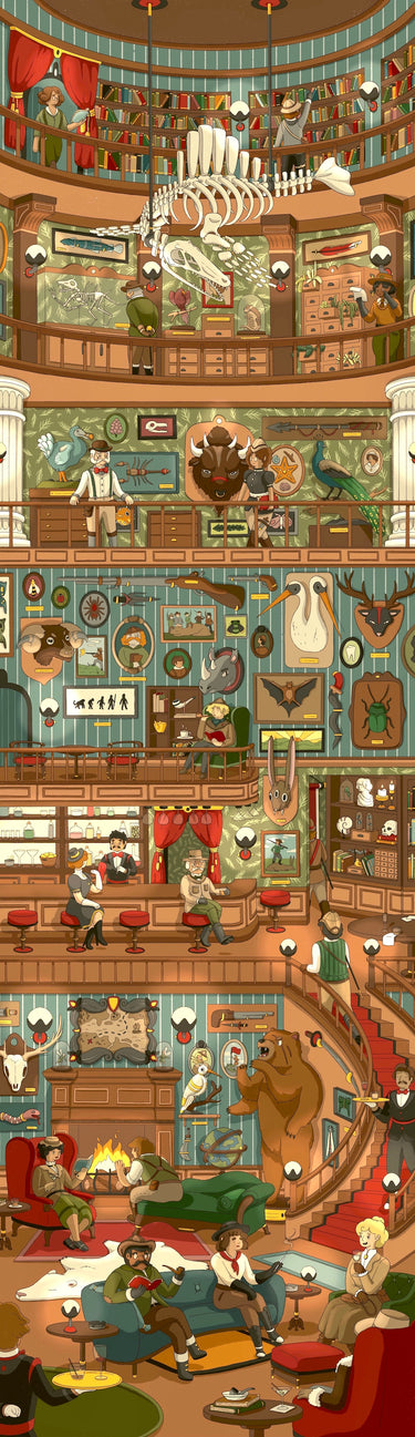 This 508 piece wooden jigsaw puzzle shows the highly-detailed interior of a 19th century British adventurer's club by British artist Louise Kruse, replete with natural artifacts and explorers exchanging stories and enjoying cocktails.