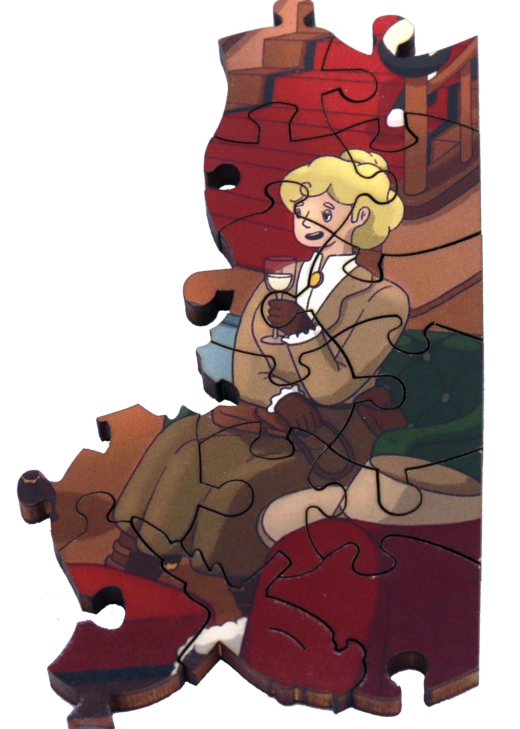 The puzzle is kind of hard despite a straight edge.  Discover the themed whimsy pieces of 19th century adventurers and fierce creatures stitched into the tessellation of curvy pieces with diverse knob connectors.  Puzzle design by Marcelle Jay Iremedio.