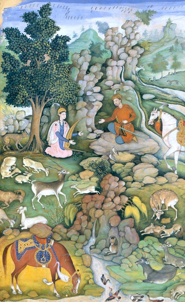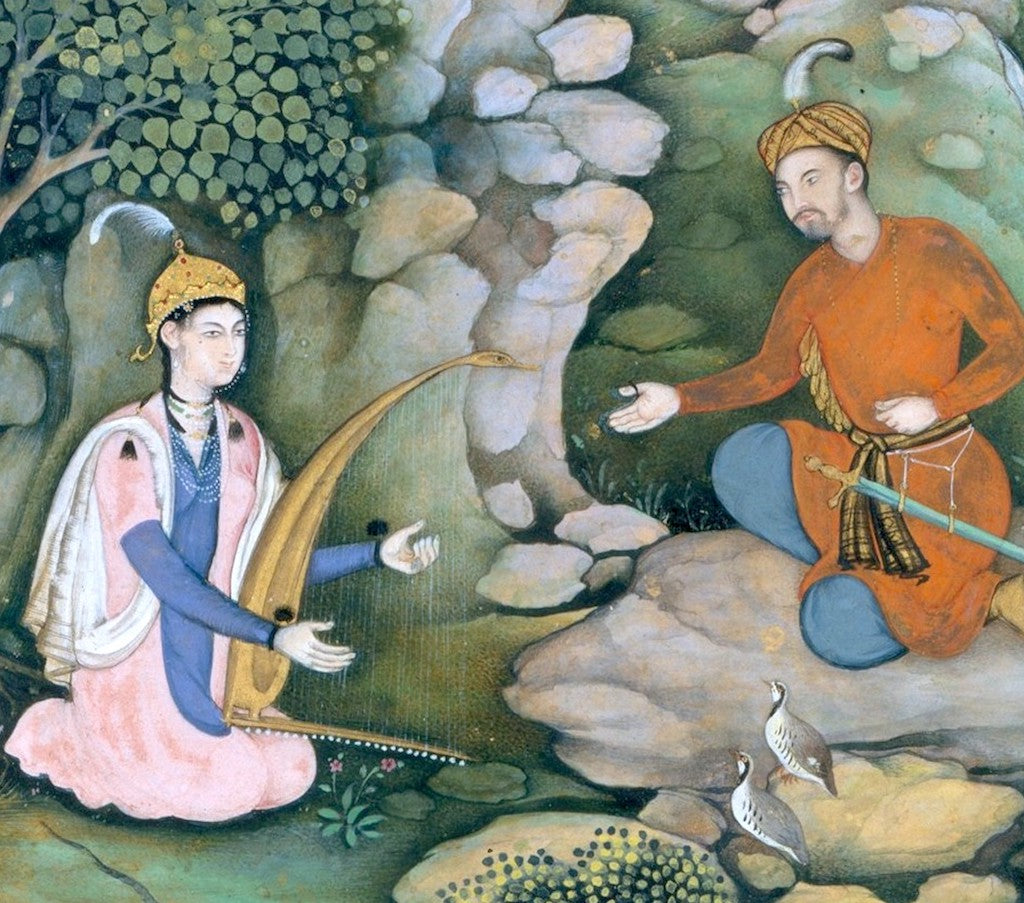 This is a 468 piece wooden jigsaw puzzle of "Dilaram Harp" by 16th Century Mughal miniature painter Miskin.
