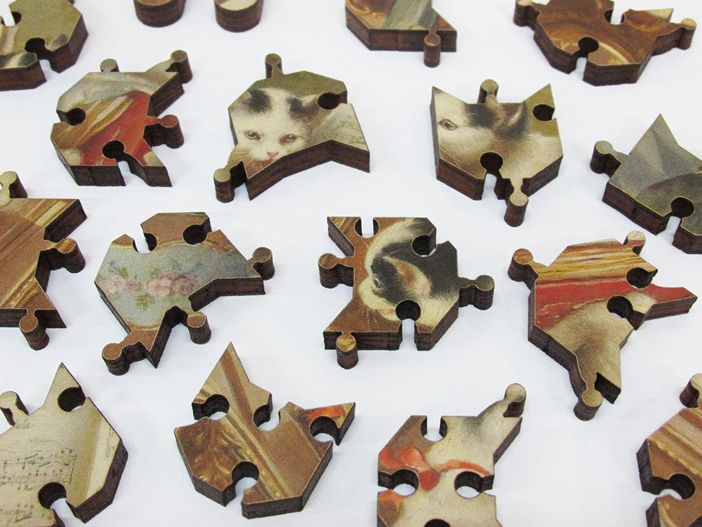Review: I typically work bigger, more difficult puzzles. But, it wasn't possible to resist a puzzle with such adorable little curious kittens, so aptly depicted in such a timeless artistic setting. Kittens Recital is just so cute, that my emotions simply demanded I buy it....immediately! Since this puzzle has only 130 pieces, it was surprising how many special features Artifact was able to include, which made working it so much fun! The cut and design of this puzzle is spectacular. The pieces run on a diagonal slant throughout the puzzle's entire body, with a few having a false flat edge; others were designed to be even more tricky, by being able to fit into the wrong spot. Many of the pieces have an edge that seems to be shaped like pointy-eared little kitten heads....so inventive! In addition, the nine whimsies are all very creatively designed and are perfectly "in tune" with the theme of the painting. This is an absolutely delightful little puzzle, and I believe just about everyone would enjoy working it!