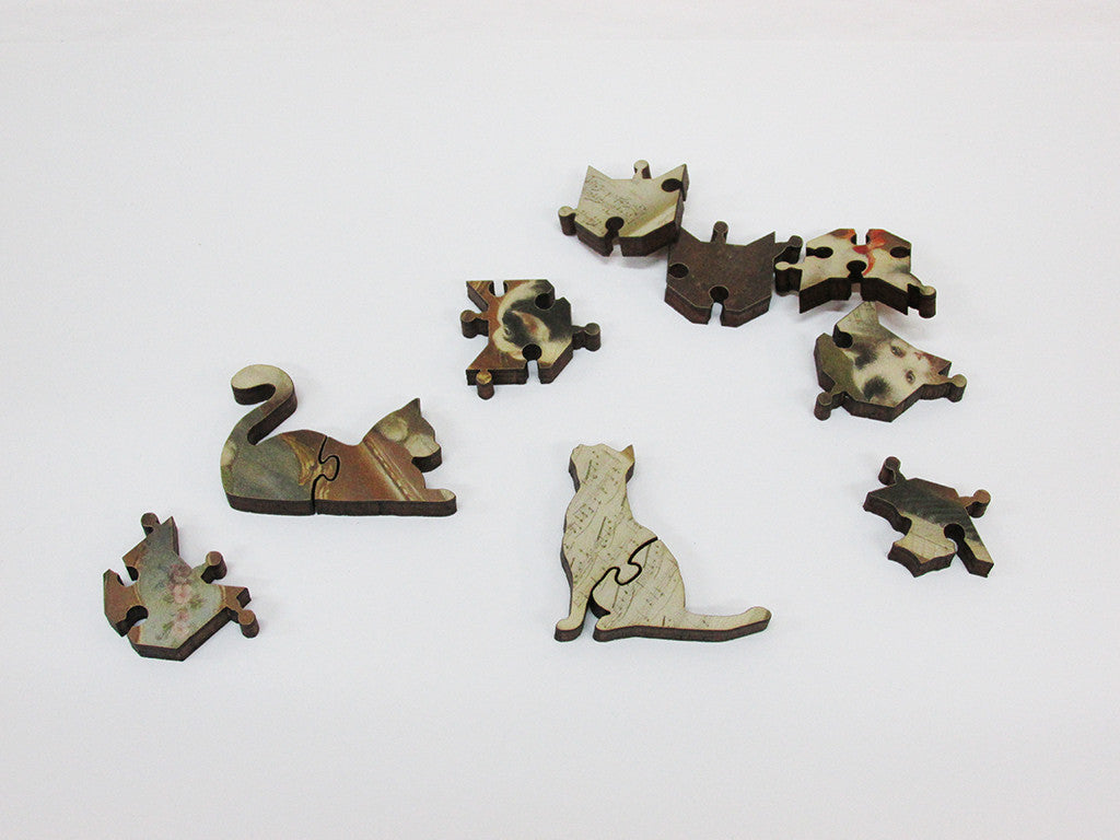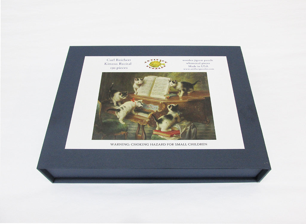 This is a 130 piece puzzle of Carl Reichert's "The Kittens' Recital." This puzzle features a regular edge, a joyful design by Jef Bambas, and a handful of adorable themed whimsies. Please be warned the puzzle will be darker in real-life than it looks on your screen! This puzzle has an average difficulty. Like all our puzzles, laser-cut from 1/4" thick wood. Packaged in a small blue box with magnetic clasp. Made in USA.