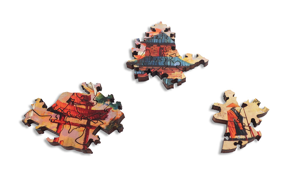 This is a 346 piece wooden jigsaw puzzle of "Sage of Yamatai" by Roch Urbaniak. You don't need to crane your head to see the beauty in this art, and you'll enjoy the ascent of solving this puzzle designed by David Figueiras. With its irregular border, varied connectors, and themed whimsies, it boasts an enlightened overall design, and is kind-of hard.