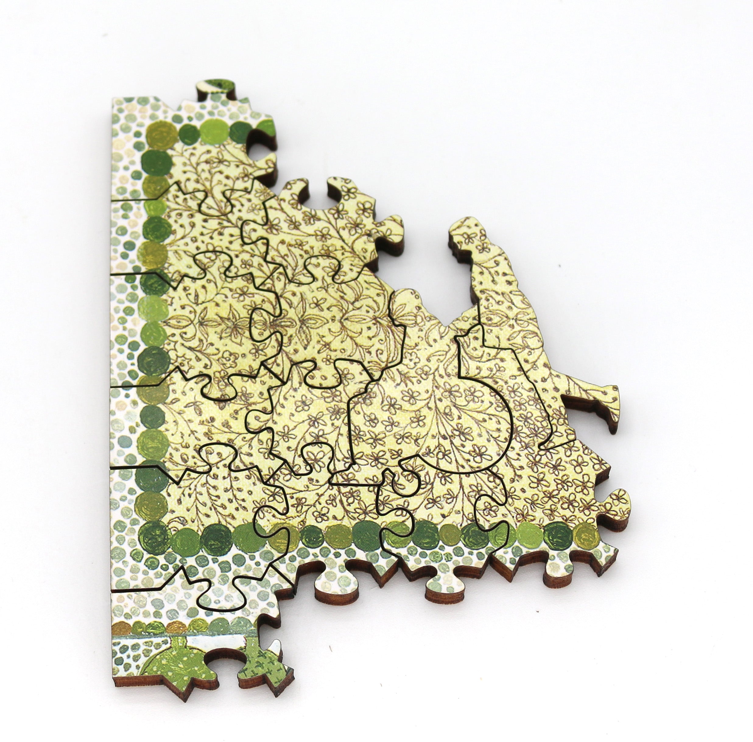 The puzzle is from our Ecru line, with a matte image for reduced glare, but because the image is matte and light, it may show a little noticeable yellowing from the laser-cutting here or there, but it will blend in nicely with the natural look of the image.