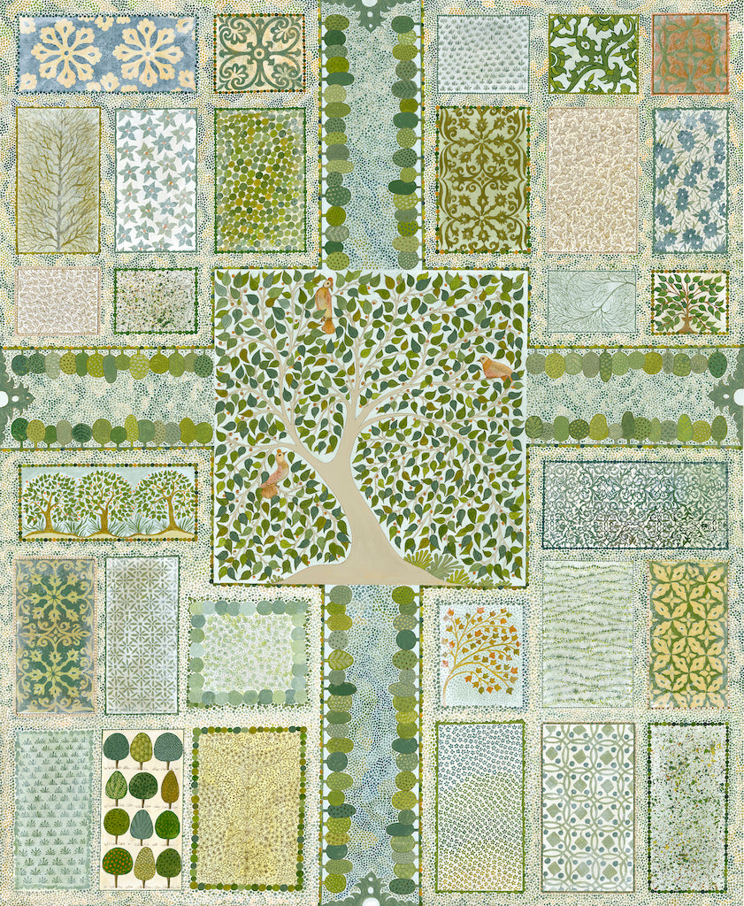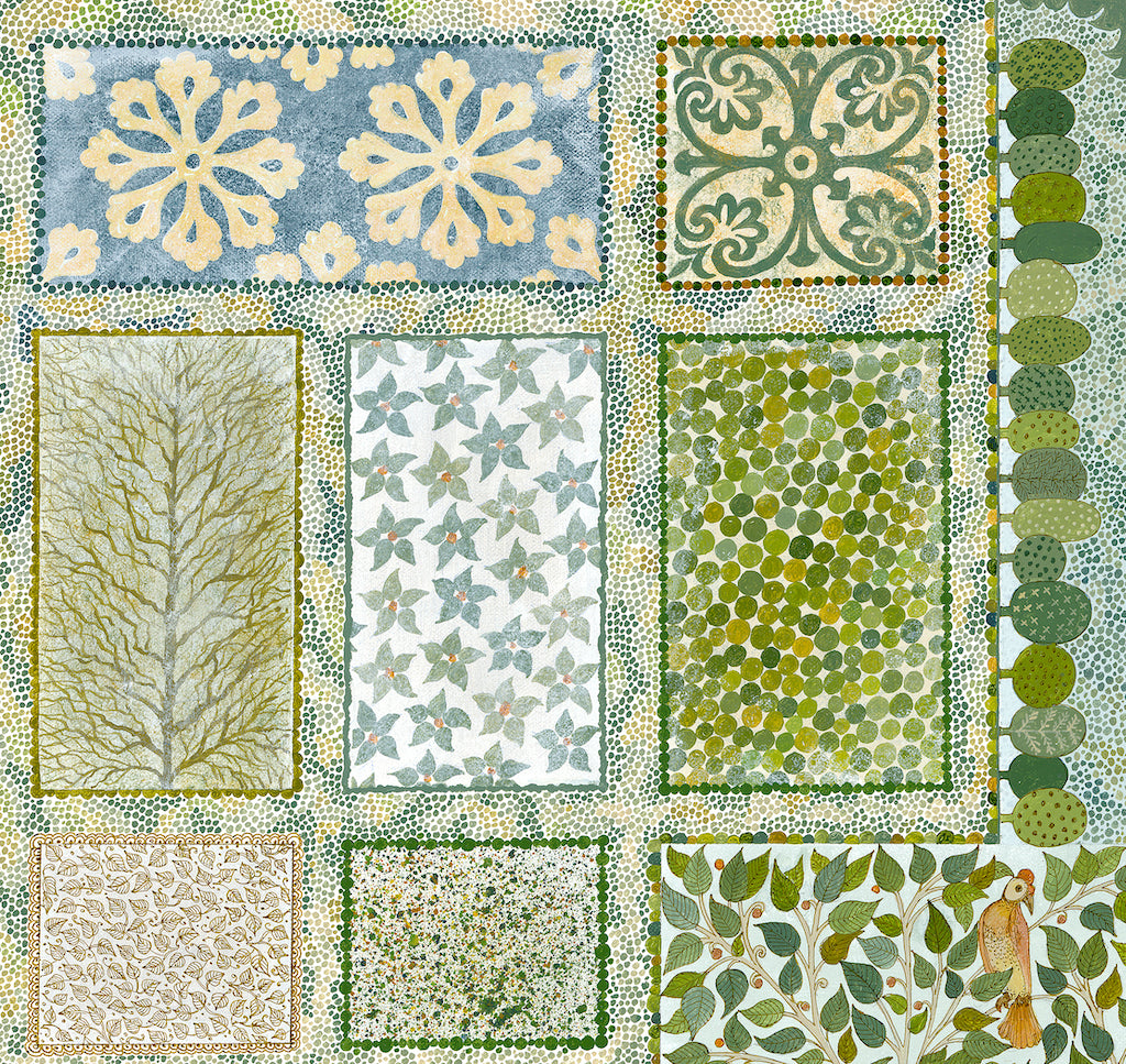 We think you'll find this puzzle harder-than-average for its piece count despite its straight edge because of the repeated background dot imagery and similar colors through-out, though each mini-garden has its own unique texture. There are quite a few oasis and garden themed whimsy pieces, and the rest of the piece shapes alternate between two shapes reminiscent of Italian tiles. Puzzle design by Matt Lyon.