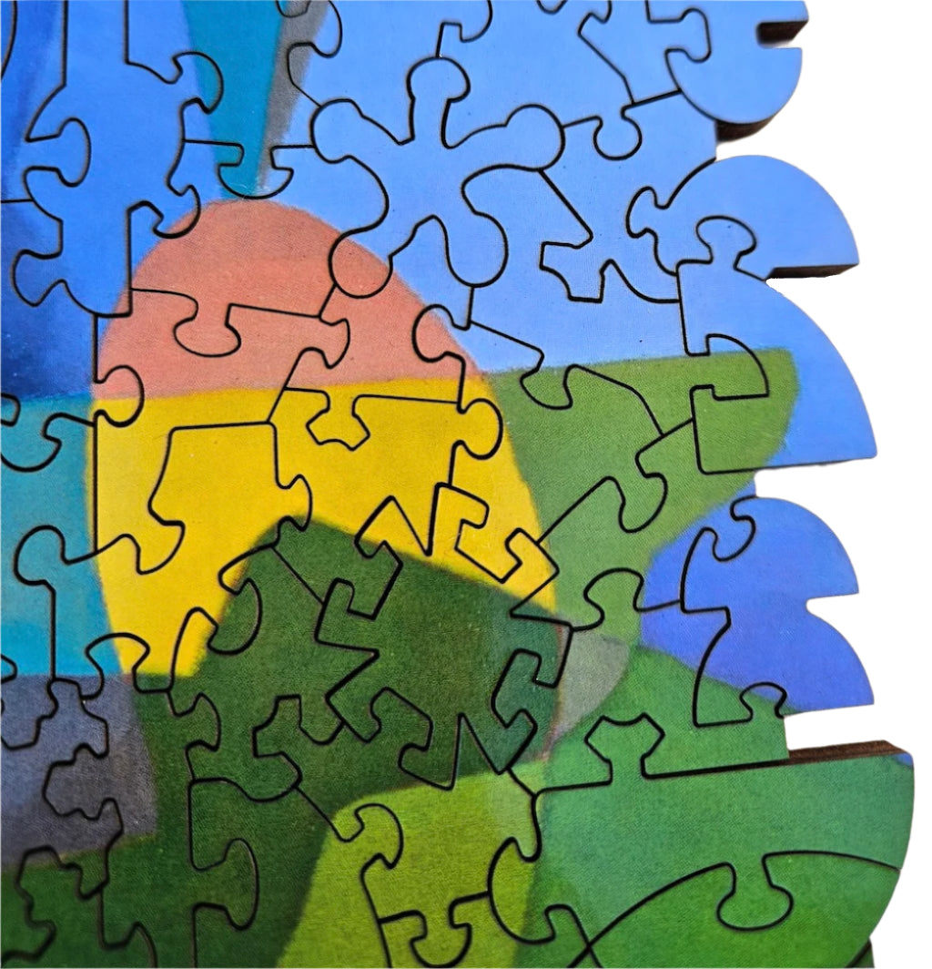This ode to color and movement is a 346 piece wooden jigsaw puzzle of the 1955 painting Jeunesse by American painter Stanton MacDonald-Wright.