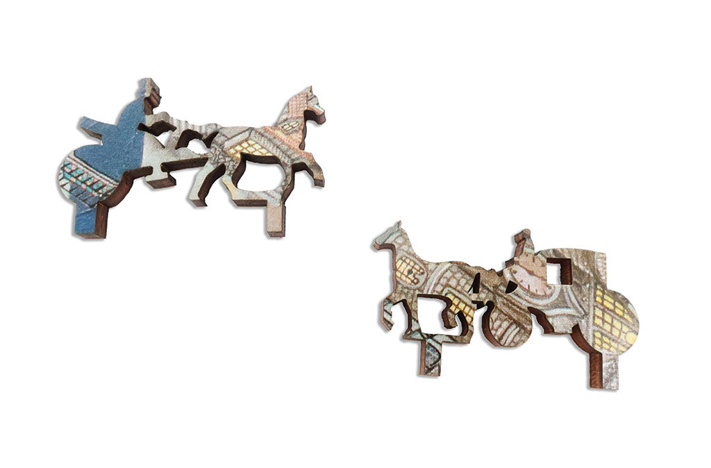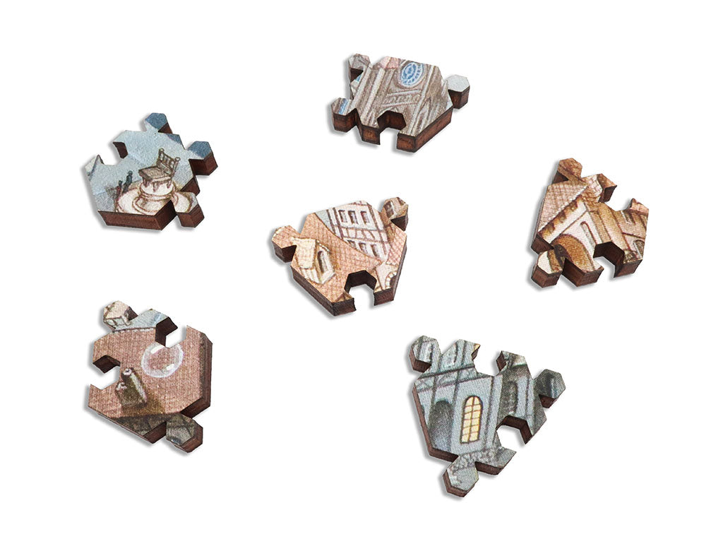The puzzle design by Jef Bambas uses hexagonal pieces with identical hexagonal connectors, and very few whimsies, requiring careful perusal of the highly-detailed image - this is a really hard puzzle!