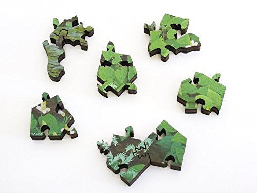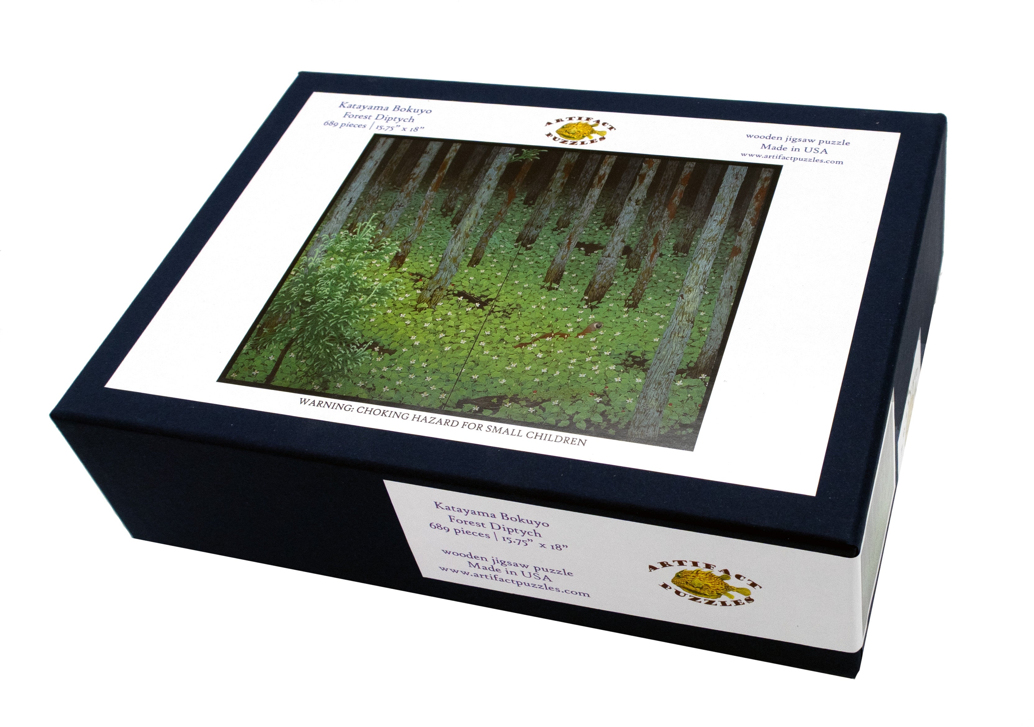 This is a very hard 689 piece wooden jigsaw puzzle of a richly detailed 1928 diptych painting of a forest by Katayama Bokuyo. Our puzzle has mushroomy and leafy connectors and pentagonal pieces. Forest-themed whimsy pieces abound. Puzzle design by Tara Flannery and Jim Muller. This puzzle has a straight edge, but it's very difficult. Like all our puzzles, the pieces are laser-cut from 1/4 inch thick wood.