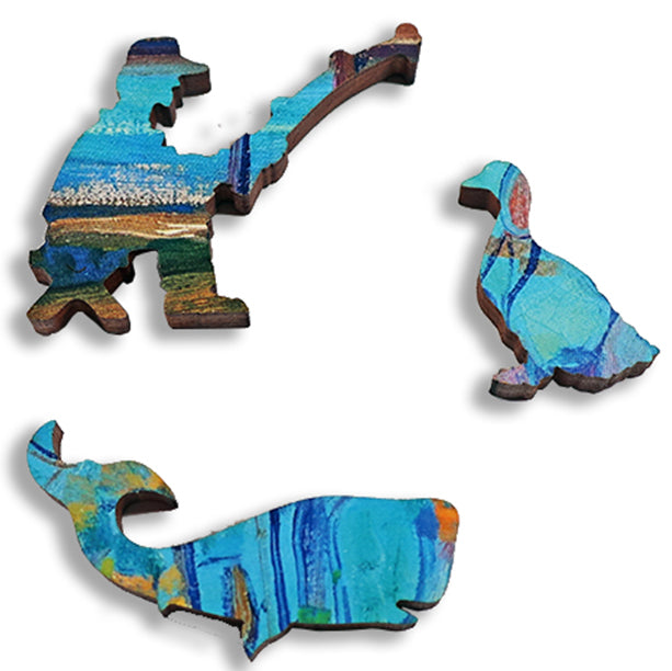 This 158 piece wooden jigsaw puzzle features American Allen Gilbert Cram's colorful post-impressionist seascape. Our Ecru puzzles line has matte images that are easier on the eyes. The puzzle's design, by David Figueras, is built with a triangular structure and features whimsies that would feel at home in the cheerful art. This puzzle is a bit harder than average.