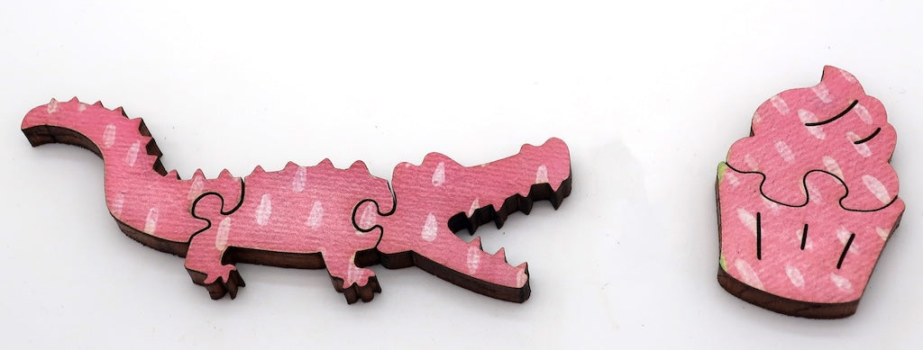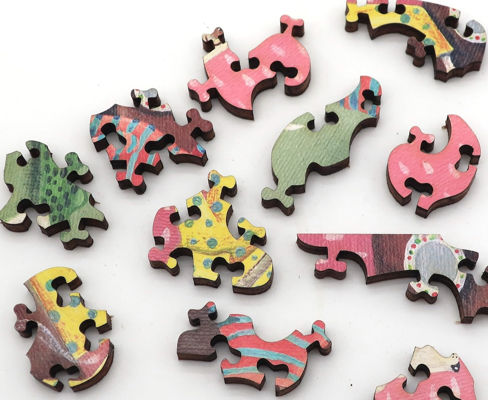 This puzzle is average hard, with whimsical irregular edge, themed whimsy pieces, irregular piece shapes, and earlet connectors. The irregular edge is NOT shown on the box! Puzzle design by Marcelle Jay Iremedio.