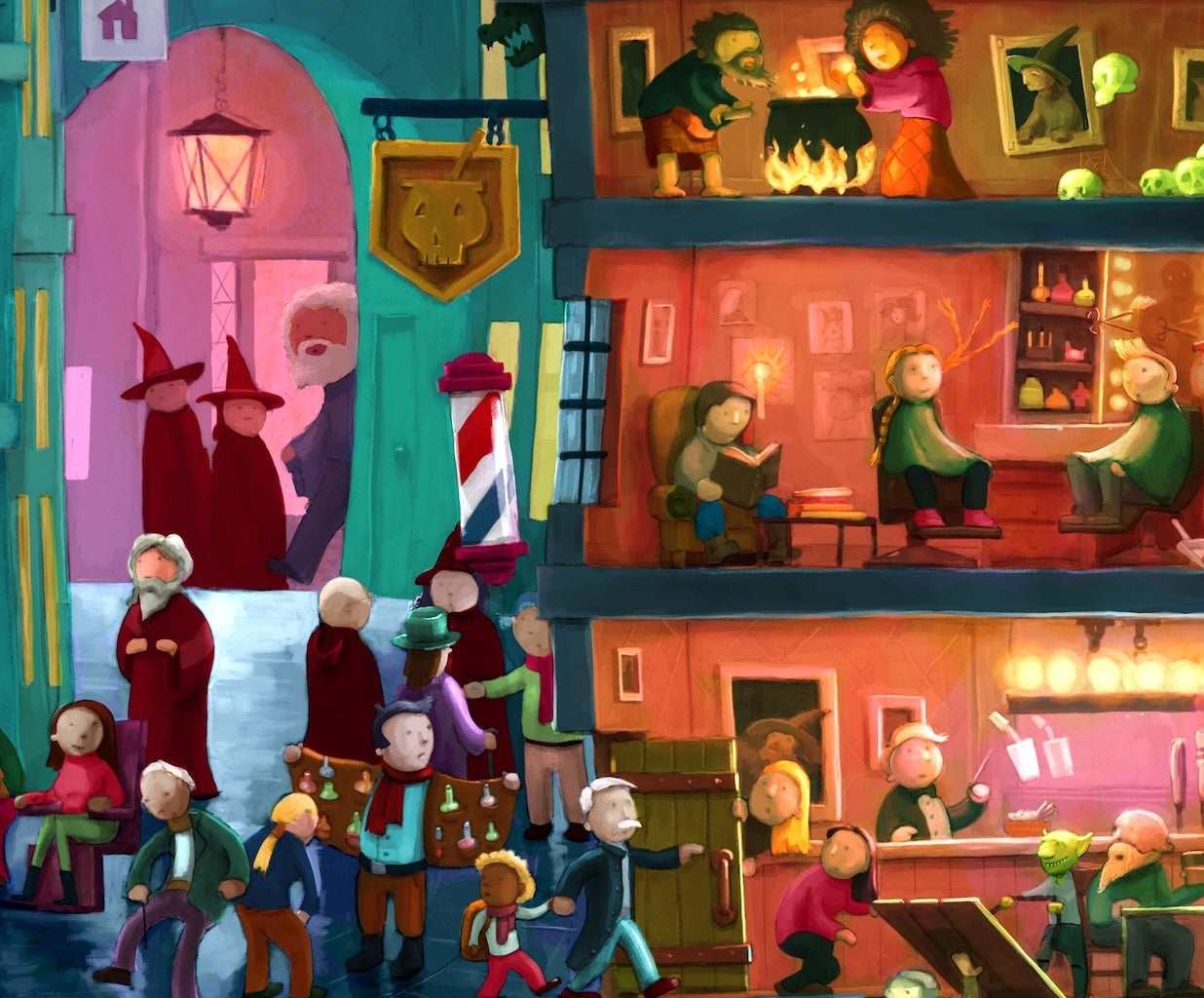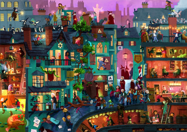 This is a 433 piece wooden jigsaw puzzle of Magic Alley, a detailed scene of wizards and magical shops and exotic pets.