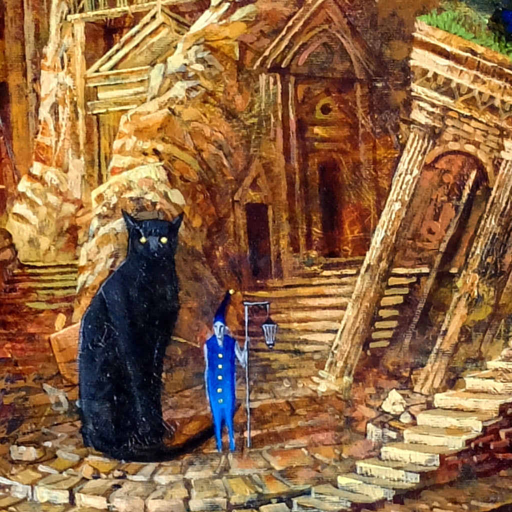 This circular wooden jigsaw puzzle has 136 pieces and features a mystical cosmic landscape with cat, painted by the Polish painter Roch Urbaniak.