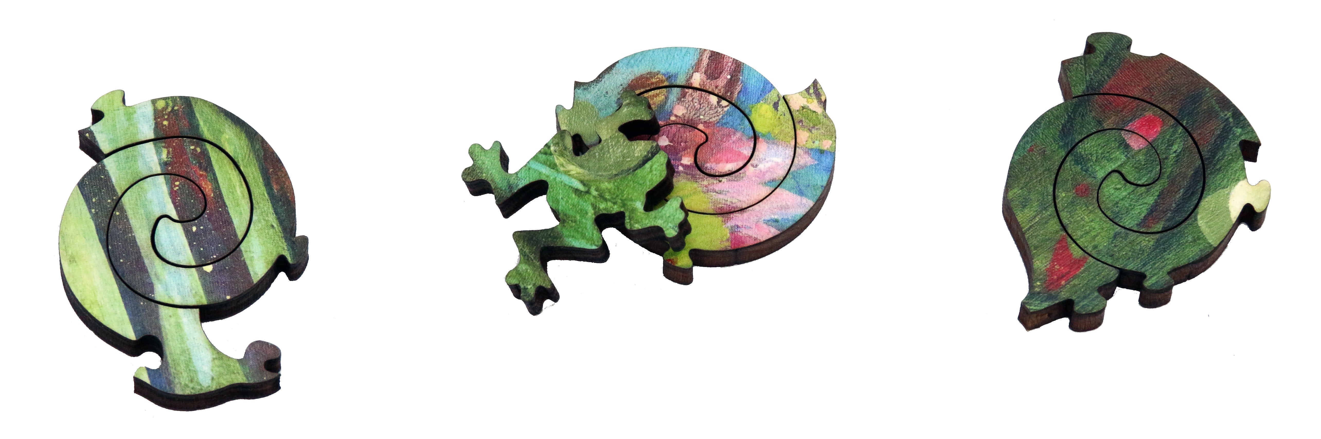 This beautiful 236 piece wooden jigsaw puzzle of a lily pond by UK painter Este MacLeod has our new nested spiral pieces, and just a few whimsies, and an irregular edge (not shown) that makes it hard to pick out the edge pieces ahead of time.