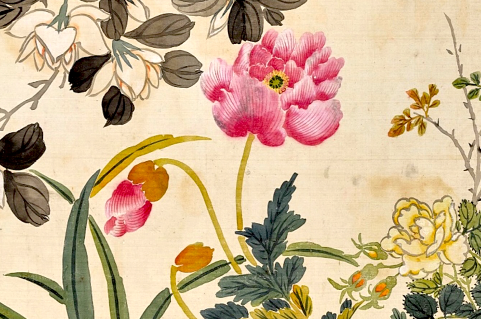 We will tell you the image is a 19th century Chinese painting of flowers with some visible weathering (as seen in the partial photo).