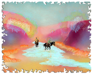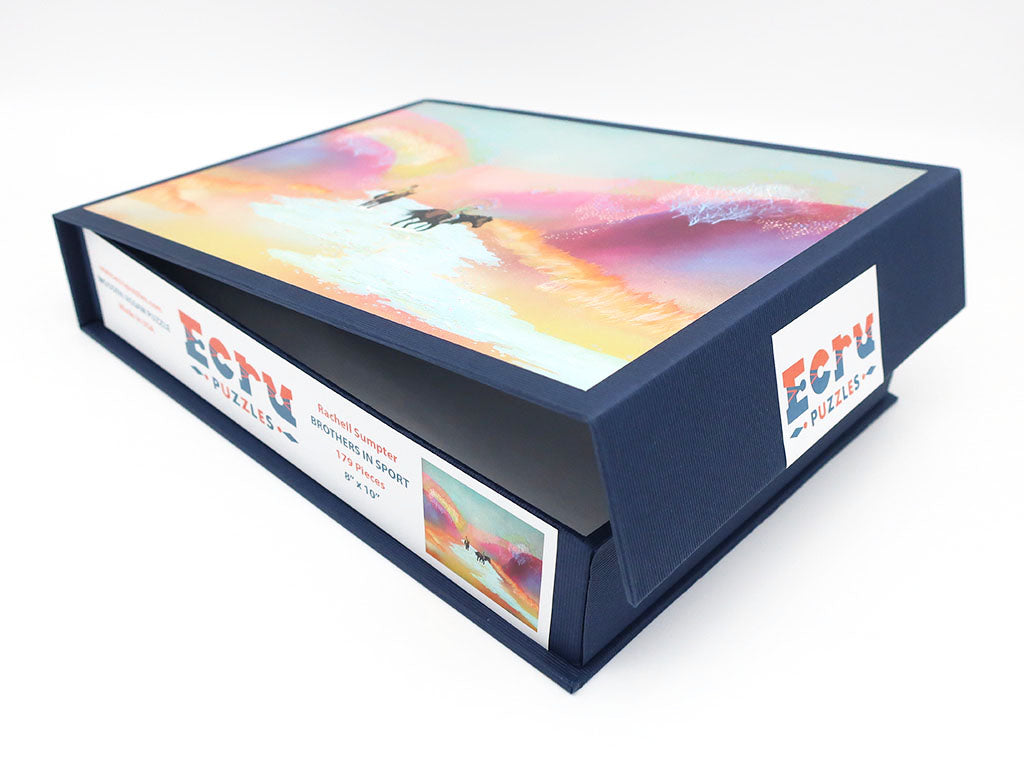 This is a 179 piece Ecru wooden jigsaw puzzle of Rachell Sumpter's "Brothers in Sport." Our Ecru puzzles line has matte images that are easier on the eyes. Sumpter's gouache and pastel art has more detail than an image here can accurately reflect.