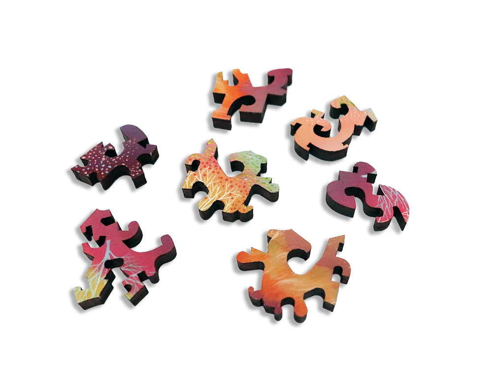 The puzzle design is by Matt Lyon, and is composed of unique piece shapes without traditional whimsies. The irregular edge is as unusual as the pieces themselves, and makes the puzzle harder than average.