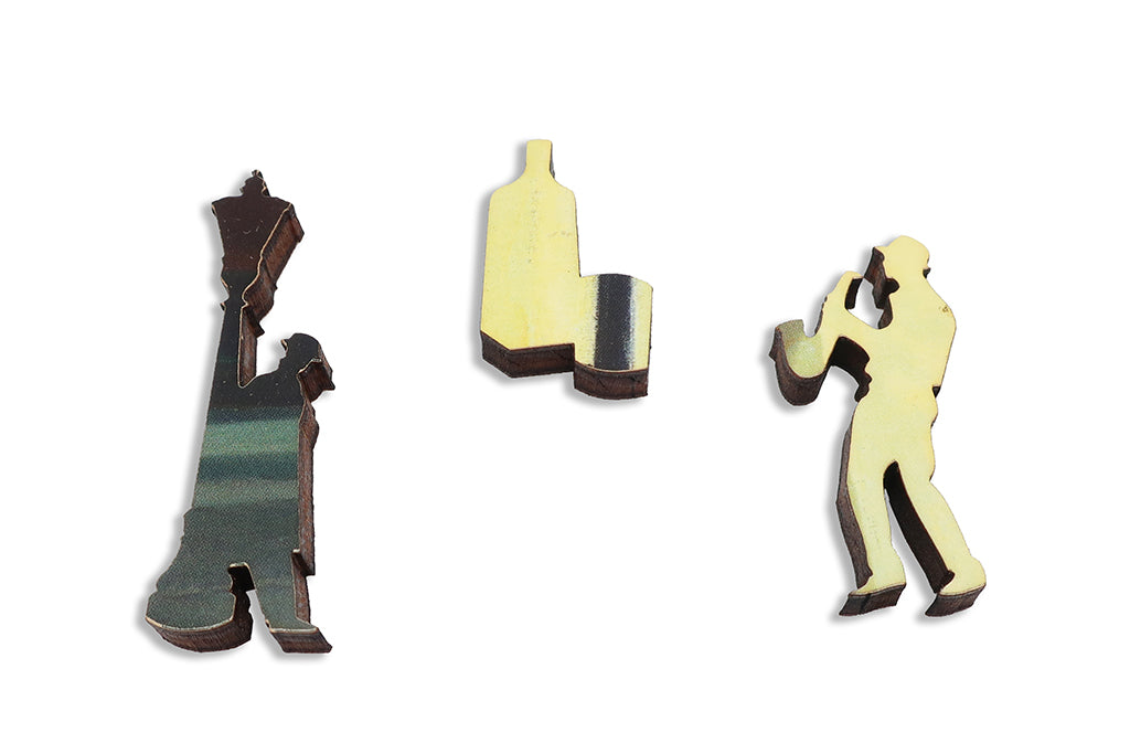 This is a 374 piece wooden jigsaw puzzle of Edward Hopper's famous 1942 painting Nighthawks. The puzzle design by Maria Berg has lots of film-noir themed whimsy pieces (including a smoking detective and a gun), bannister-top knob connectors, and rectangular pieces. This puzzle has a straight edge and average difficulty. Like all our puzzles, laser-cut from 1/4" thick wood. Packaged in our standard wood box. Made in USA.
