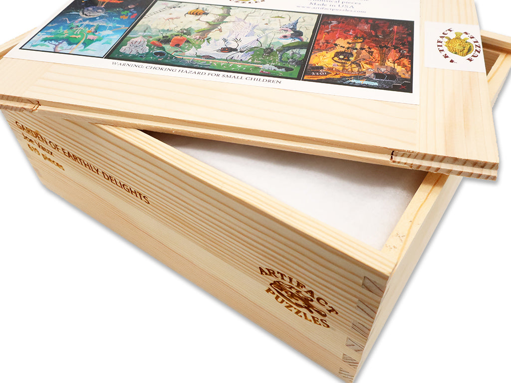 Like all our puzzles, the pieces are laser-cut from 1/4" thick wood. Packaged in one large pine wood box. Made in USA.
