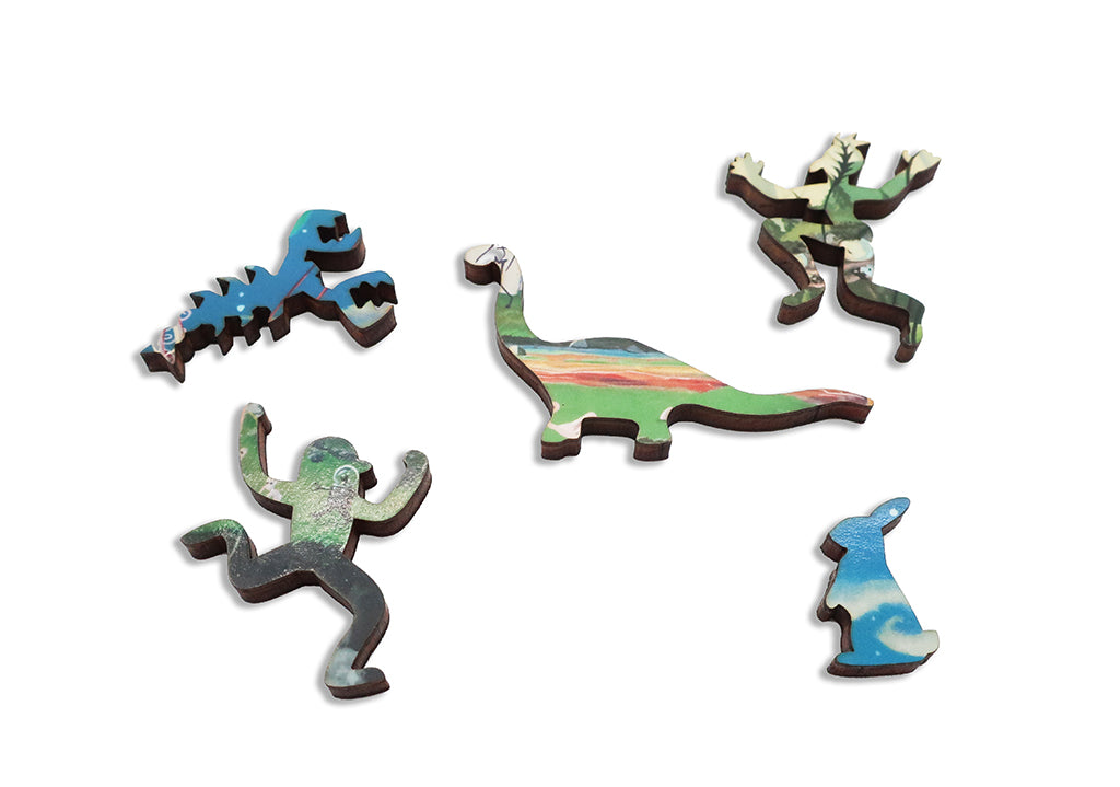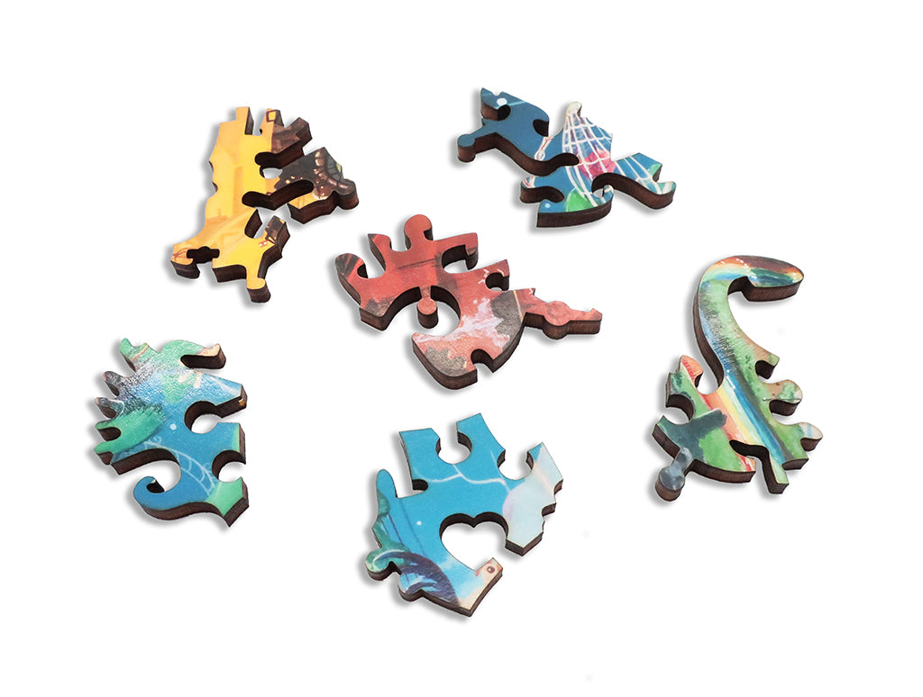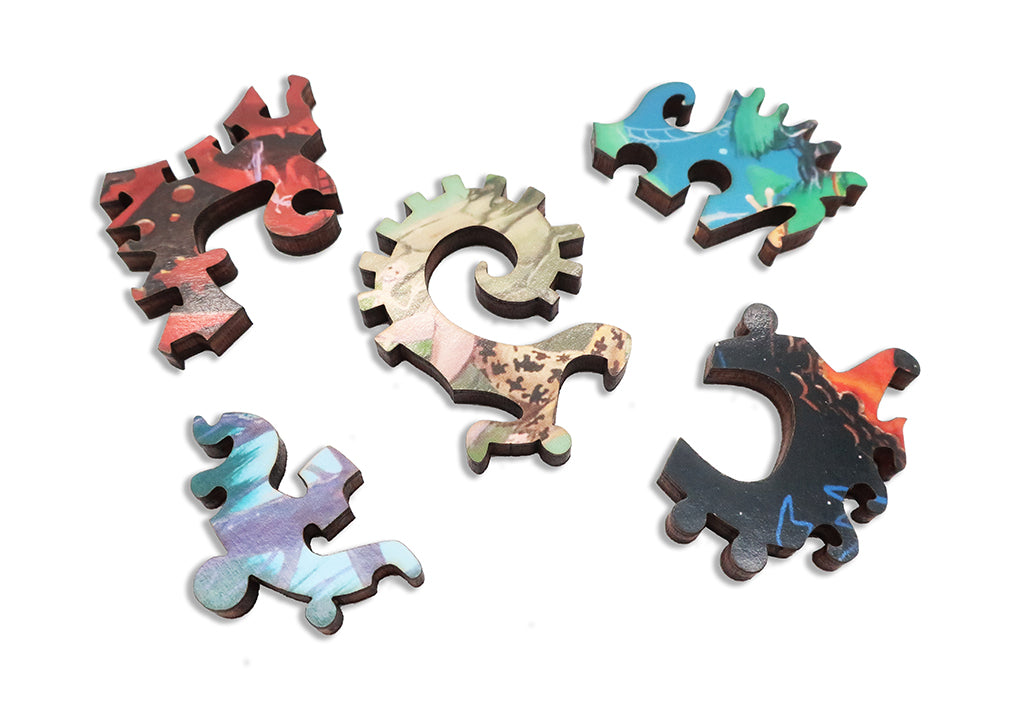 The puzzle design by Tara Flannery matches the painting's verve with themed whimsy pieces and vivacious puzzle pieces, with many of the piece-shapes inspired by the signature style of master handcutter John Stokes III.