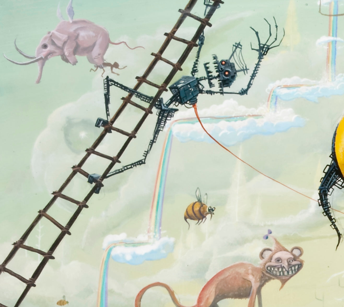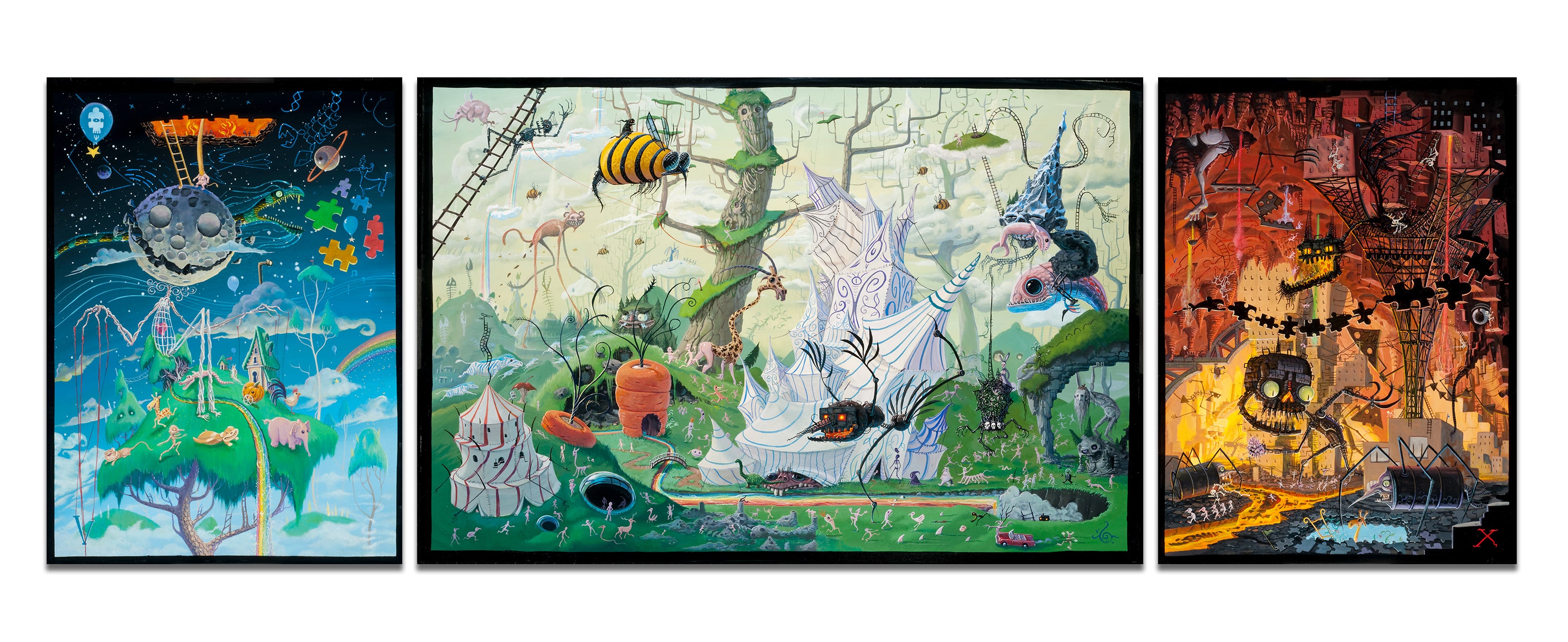 This is an incredible 619 piece wooden jigsaw puzzle of Joe Vaux's 2013 triptych "Garden of Earthly Delights," which re-visits the themes of the original work by Hieronymous Bosch from a contemporary perspective.
