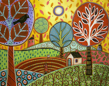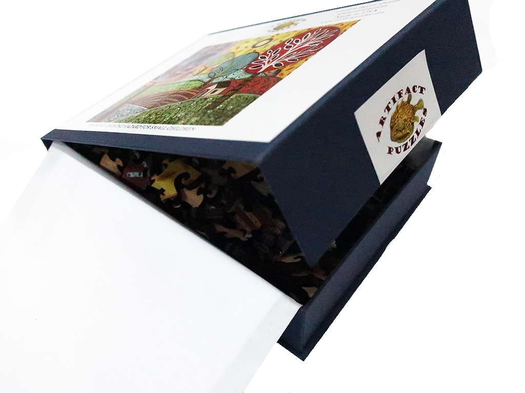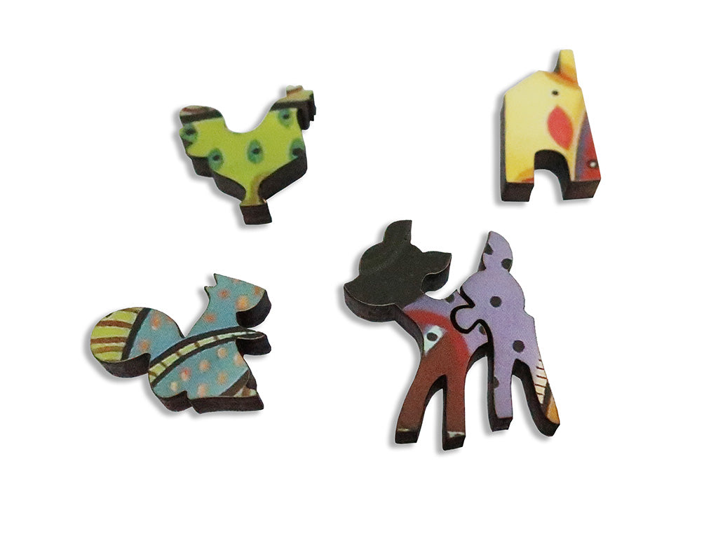 This is a cheerful 154 piece wooden jigsaw puzzle of Karla Gerard's painting "Farmland." The puzzle was designed by Tara Flannery and has a handful of themed whimsy pieces and straight edges. The puzzle's difficulty is average. Like all our puzzles, the pieces are laser-cut from 1/4" thick wood. Packaged in a small blue box with magnetic clasp. Made in USA.
