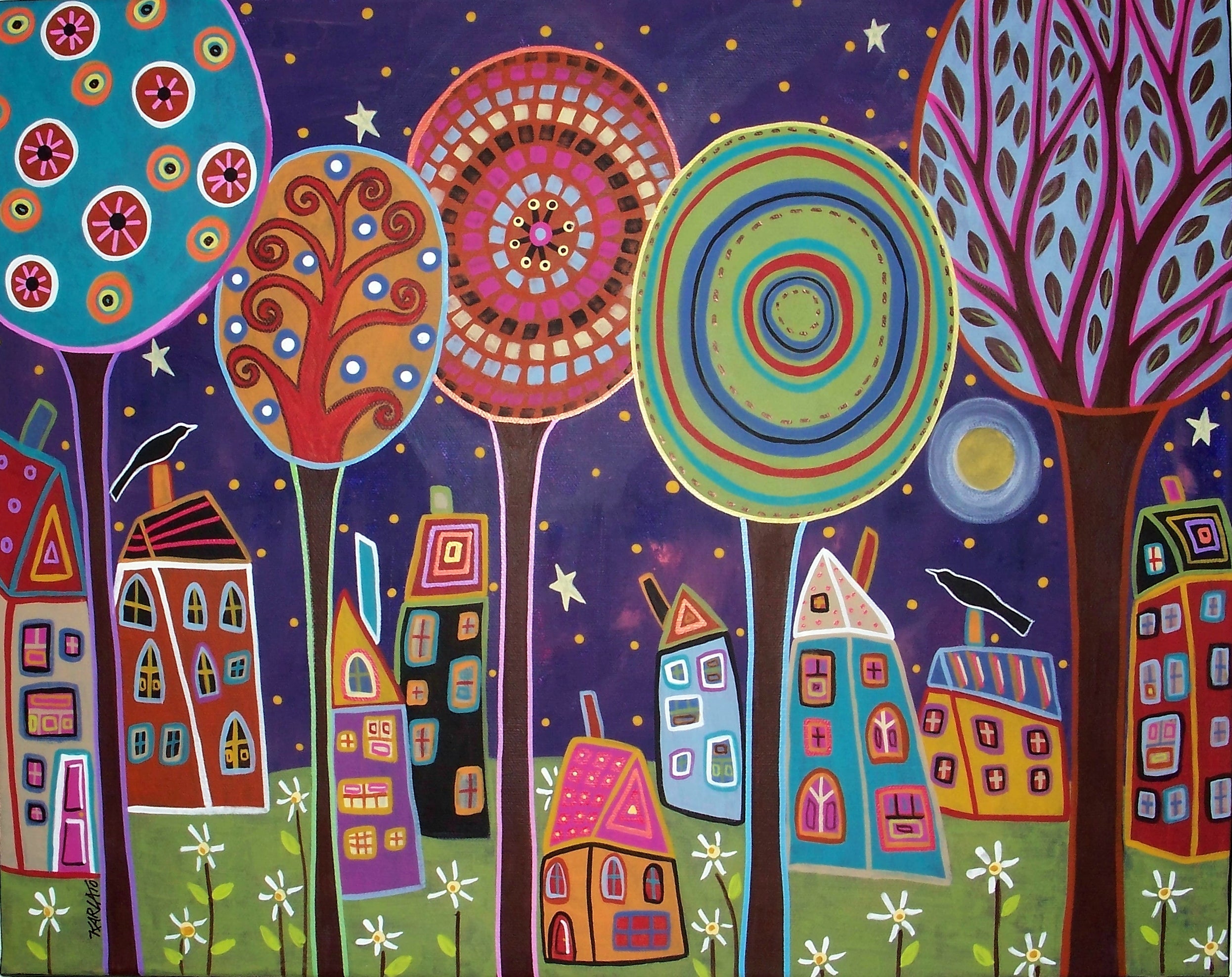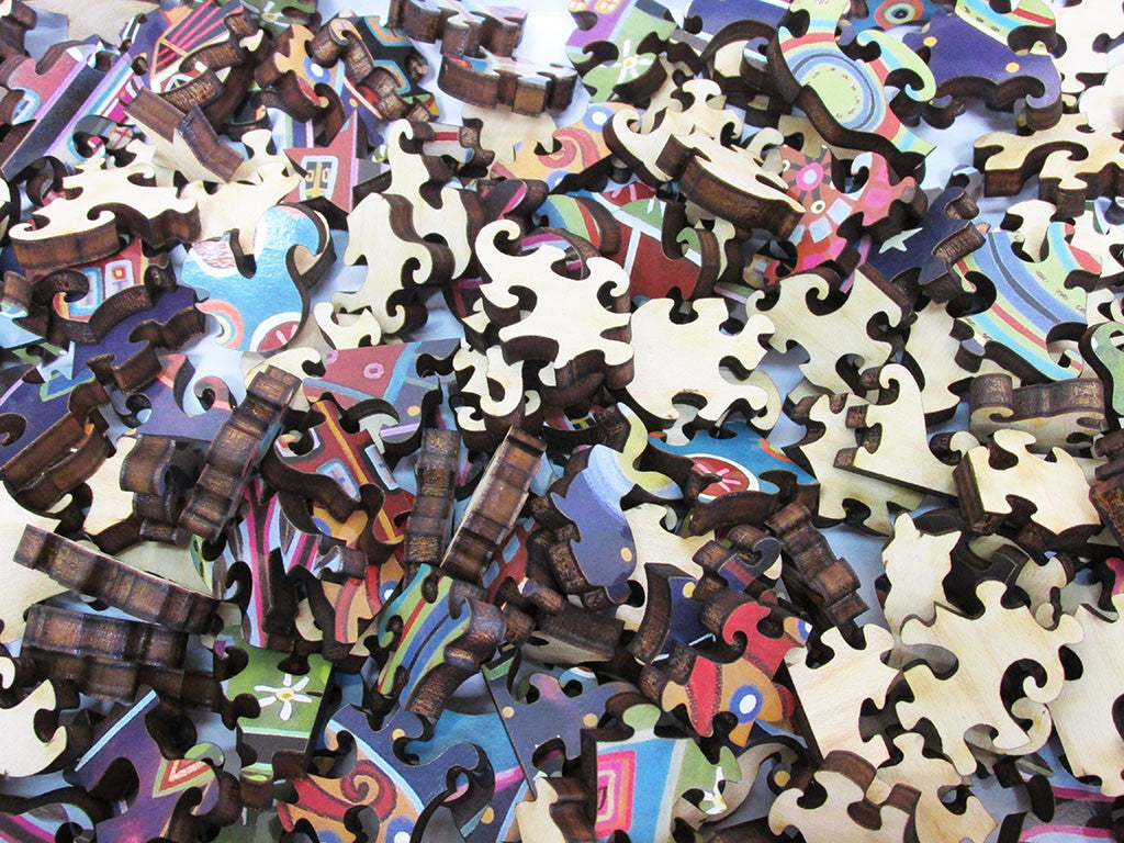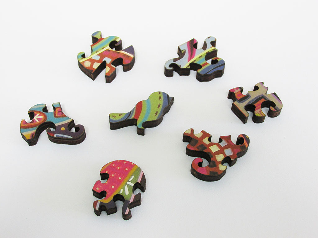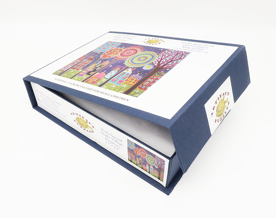 This is a fun 164 piece puzzle of Karla Gerard's Night Village. The puzzle was designed by Tara Flannery and has a handful of themed whimsy pieces, reverse-curl connectors, and a straight edge. The puzzle has an average difficulty. Like all our puzzles, the pieces are laser-cut from 1/4" thick wood. Packaged in a small blue box with magnetic clasp. Made in USA.