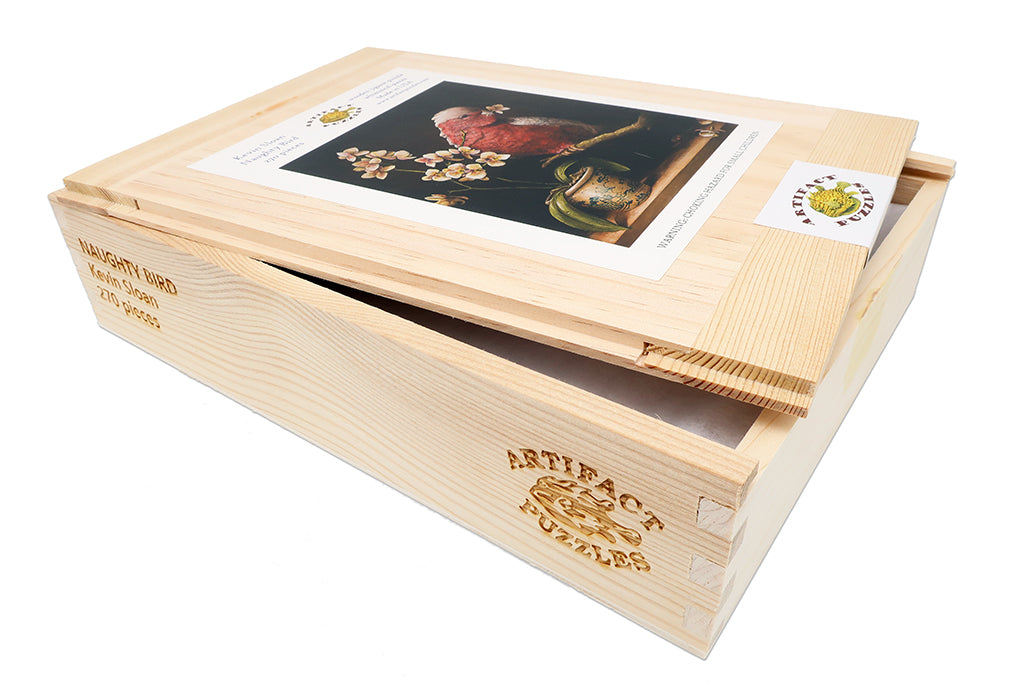 This is a delightful 270 piece wooden jigsaw puzzle of Kevin Sloan's painting "Naughty Bird." The puzzle was designed by puzzle artist Tara Flannery and features many themed whimsy pieces and reverse-mushroom curl connectors (to see example pieces, click on the small image under the main product image). The edge is partially irregular and the difficulty is average. NOTE: The irregular edge is not shown in the image on the box! Like all our puzzles, the 1/4" thick wood pieces are laser-cut. Packaged in our standard unfinished pine wood box. Made in USA.