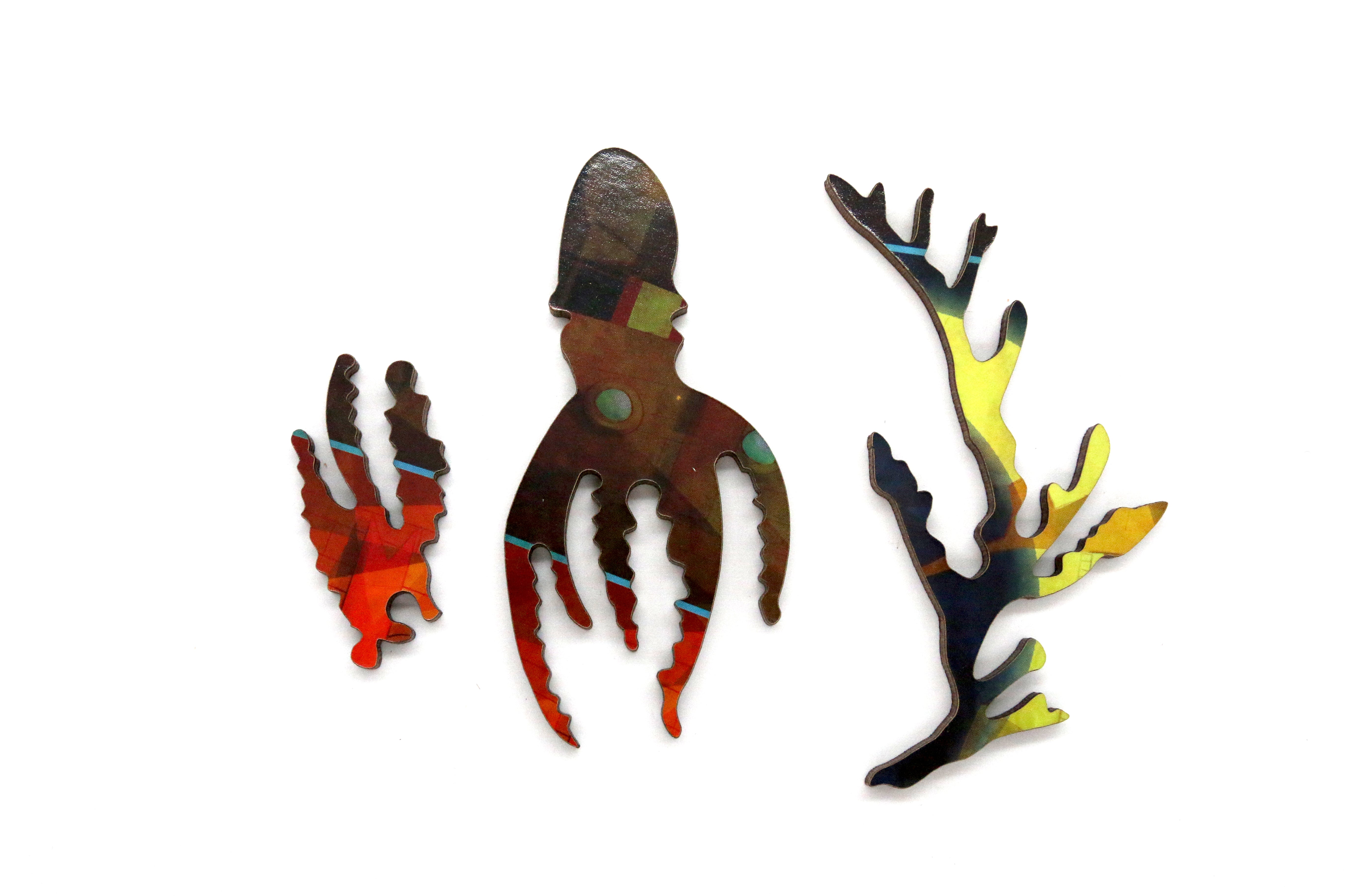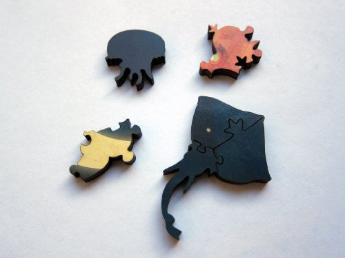 This is a 283 piece wooden jigsaw puzzle of a gorgeous image by Mexican artist Nadiezda. The puzzle design is by Kathryn Flocken, and includes numerous sea whimsy pieces with shapes like a puffer fish, a weedy seadragon, an angler fish, and even an axolotl! Connectors are shaped like stars and very-round knobs. The puzzle edge is not straight, and the top edge is a starry sky. It's harder than the average puzzle. To see example pieces and a photo of the completed puzzle, click on the small image below the product image. Like all our puzzles, laser-cut from 1/4" wood. Packaged in our standard pine wood box. Made in USA.